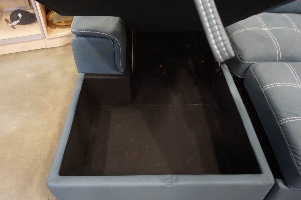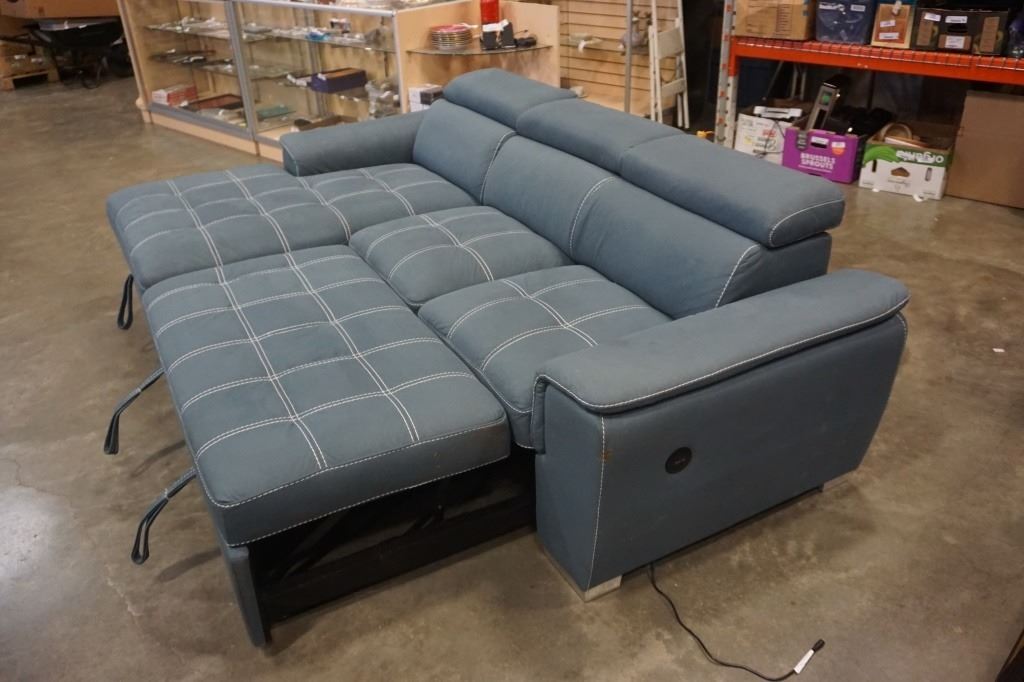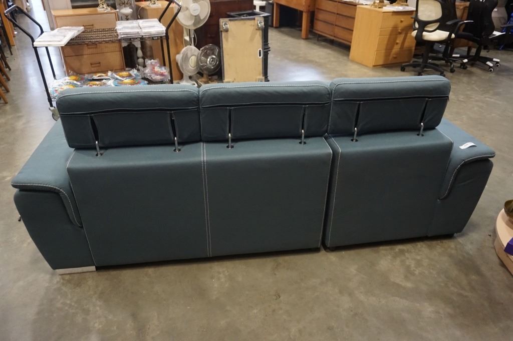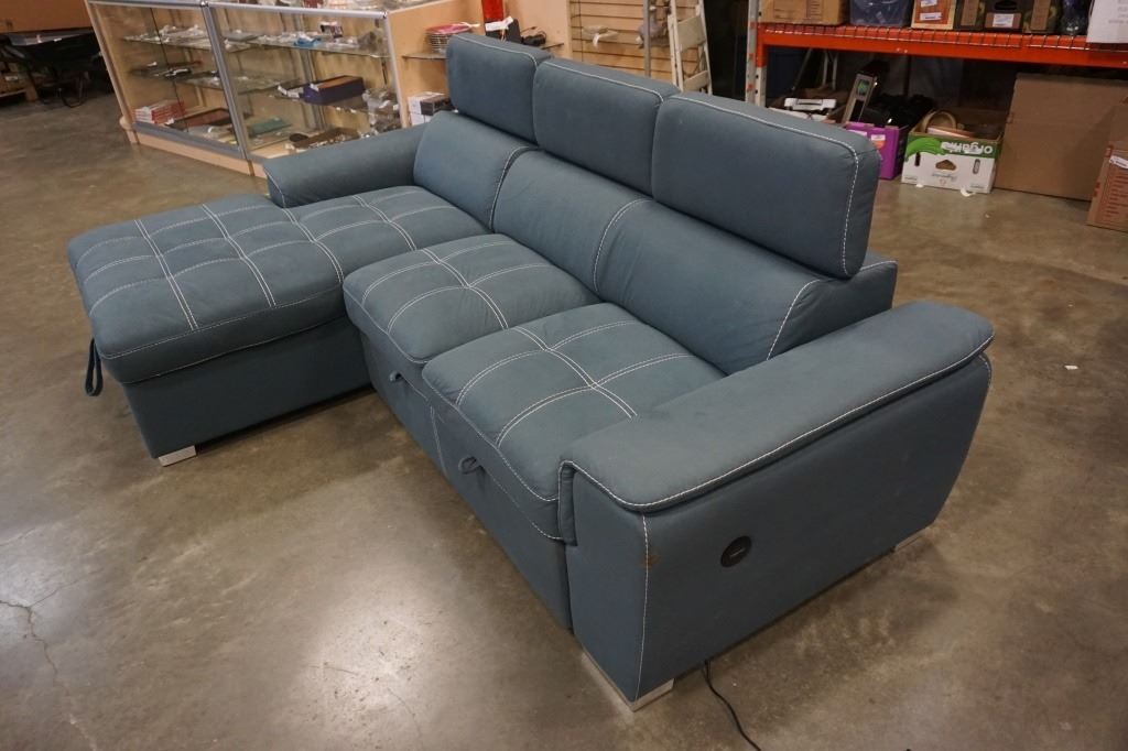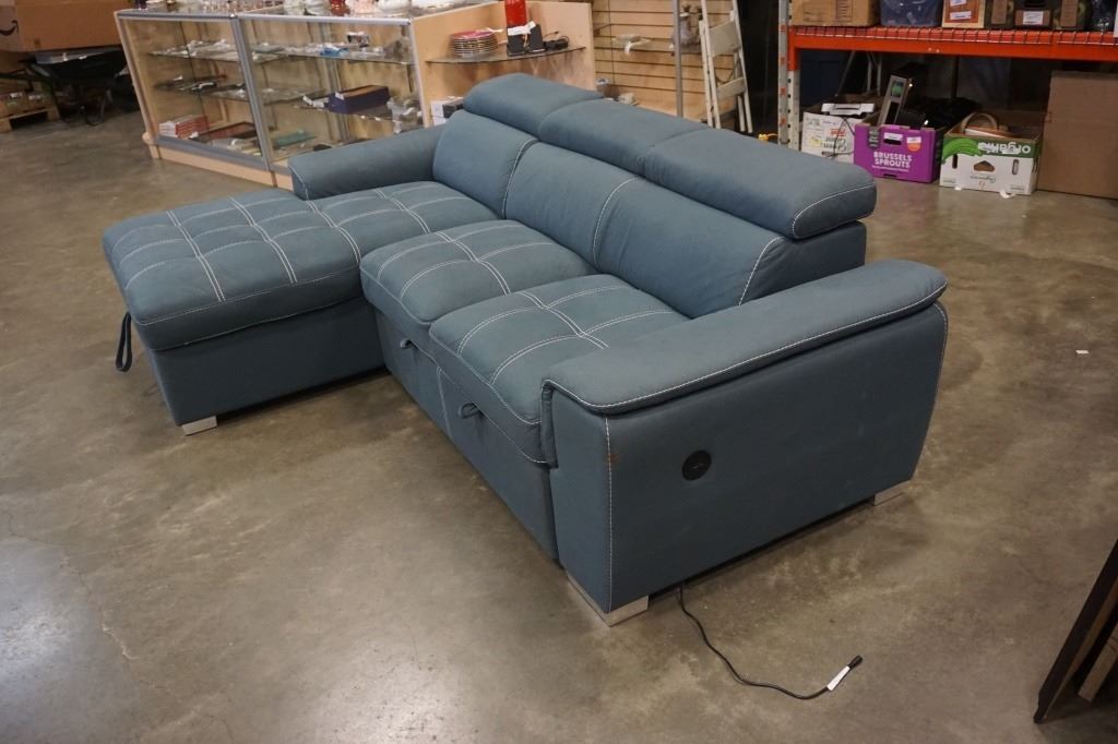 BLUE 2 PIECE SECTIONAL WITH WHITE STICHING, STORAGE CHAISE, ADJUSTABLE HEADRESTS AND PULLOUT SECTION