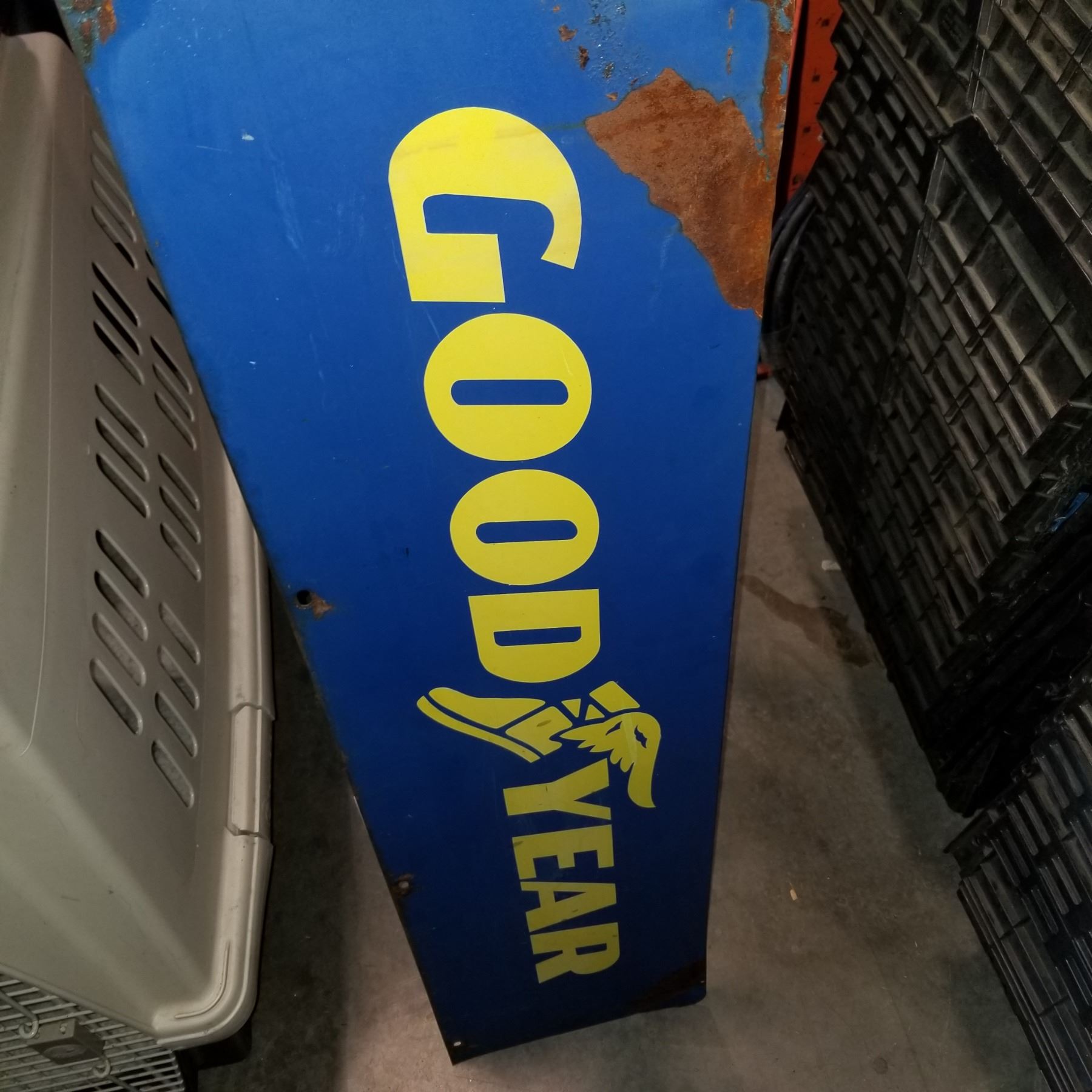BLUE AND YELLOW METAL GOOD YEAR SIGN DOUBLE SIDED
