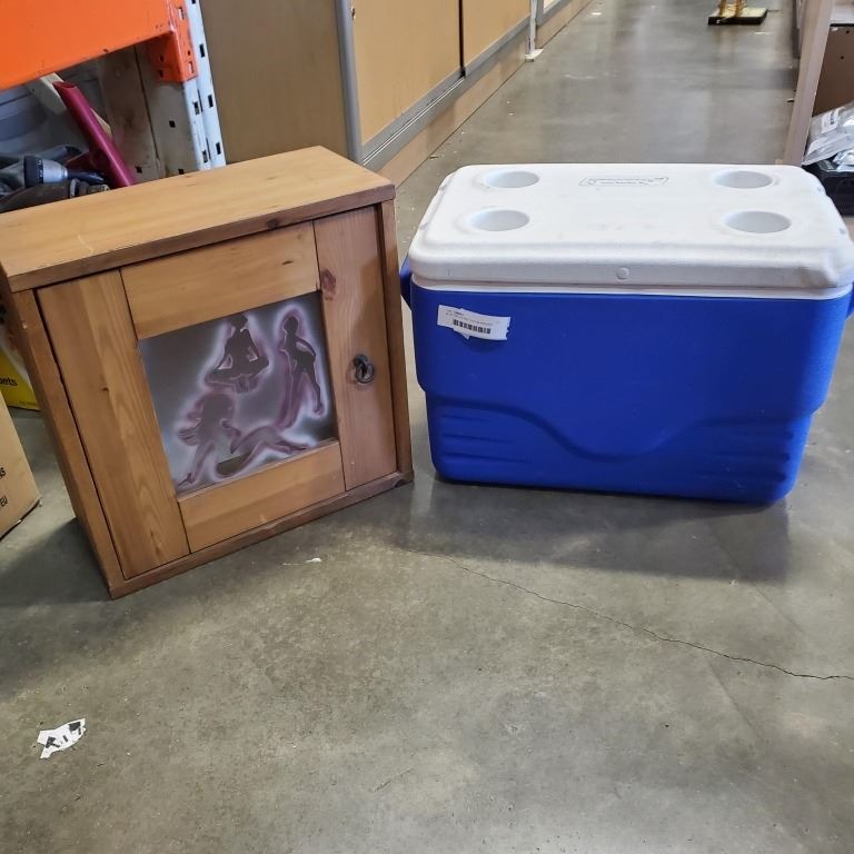 BLUE COOLER AND CUSTOM WOODEN SHELF