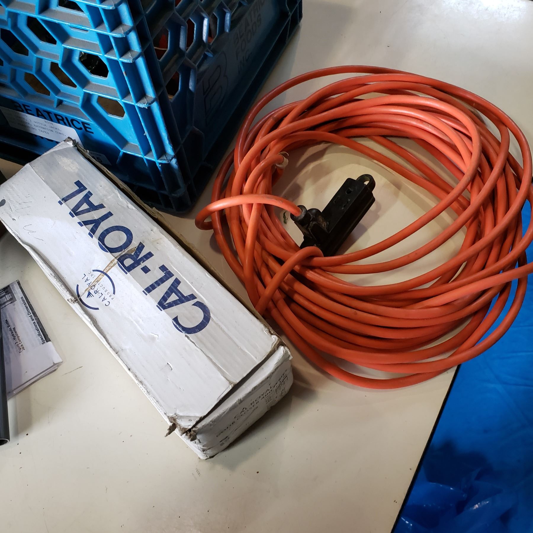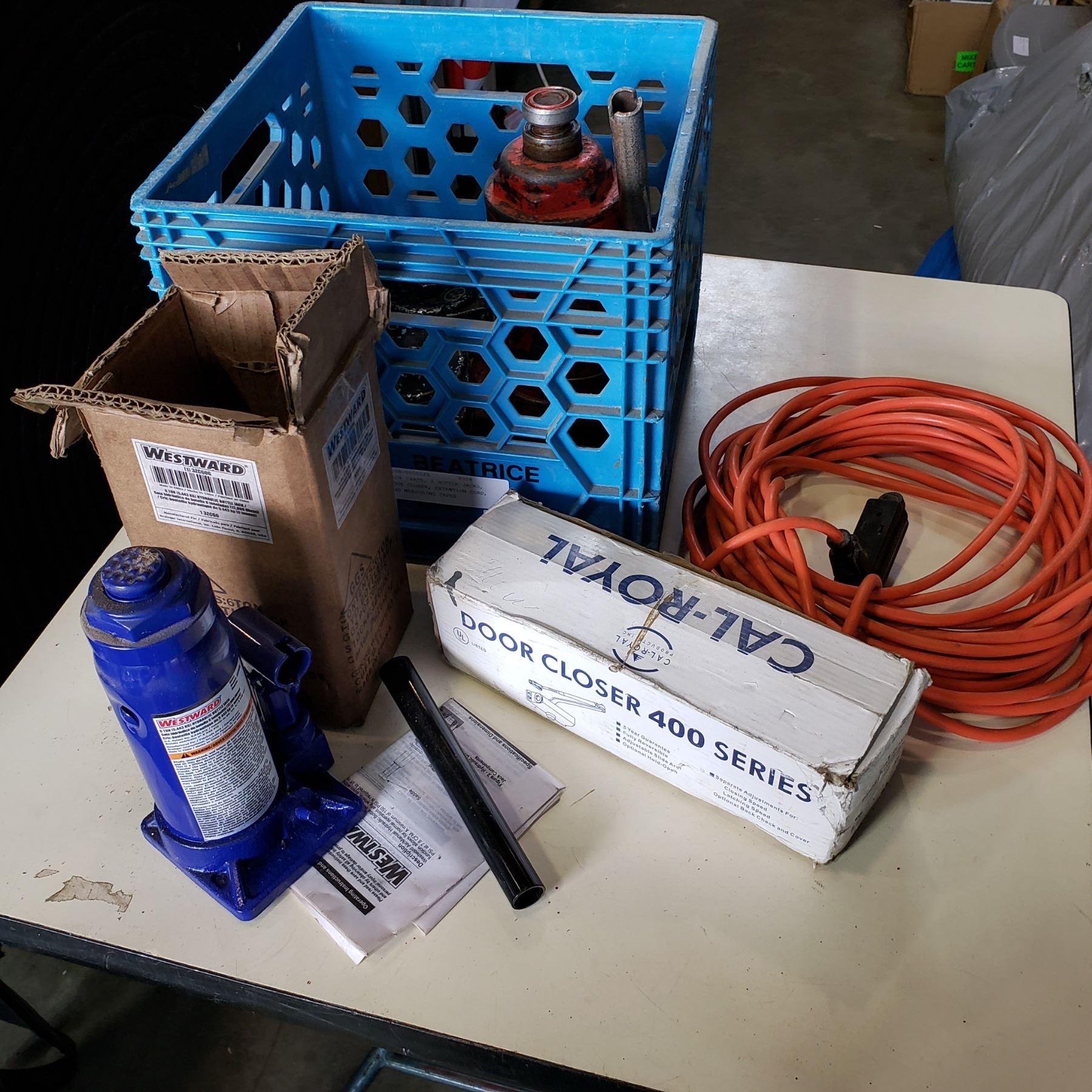 BLUE CRATE, 2 BOTTLE JACKS, DOOR CLOSER, EXTENTION CORD, AND MEASURING TAPES