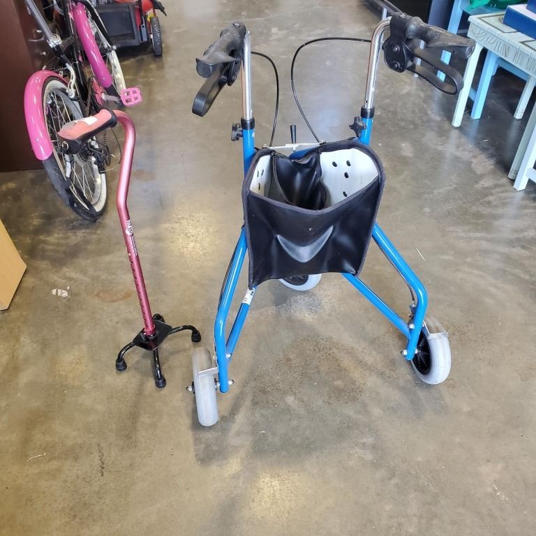 BLUE FOLDING WALKER AND HUGO WALKING CANE