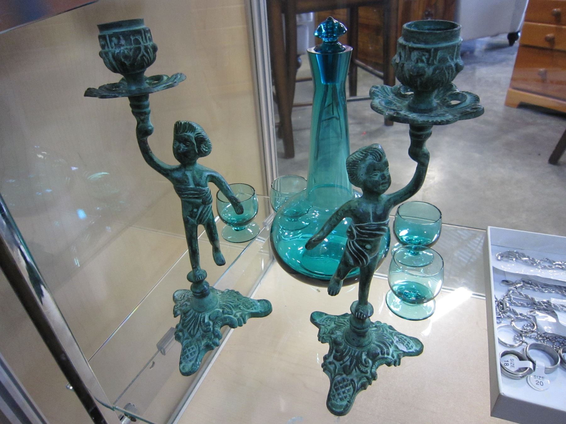 BLUE GLASS DECANTER SET AND 2 METAL CANDLE STICKS