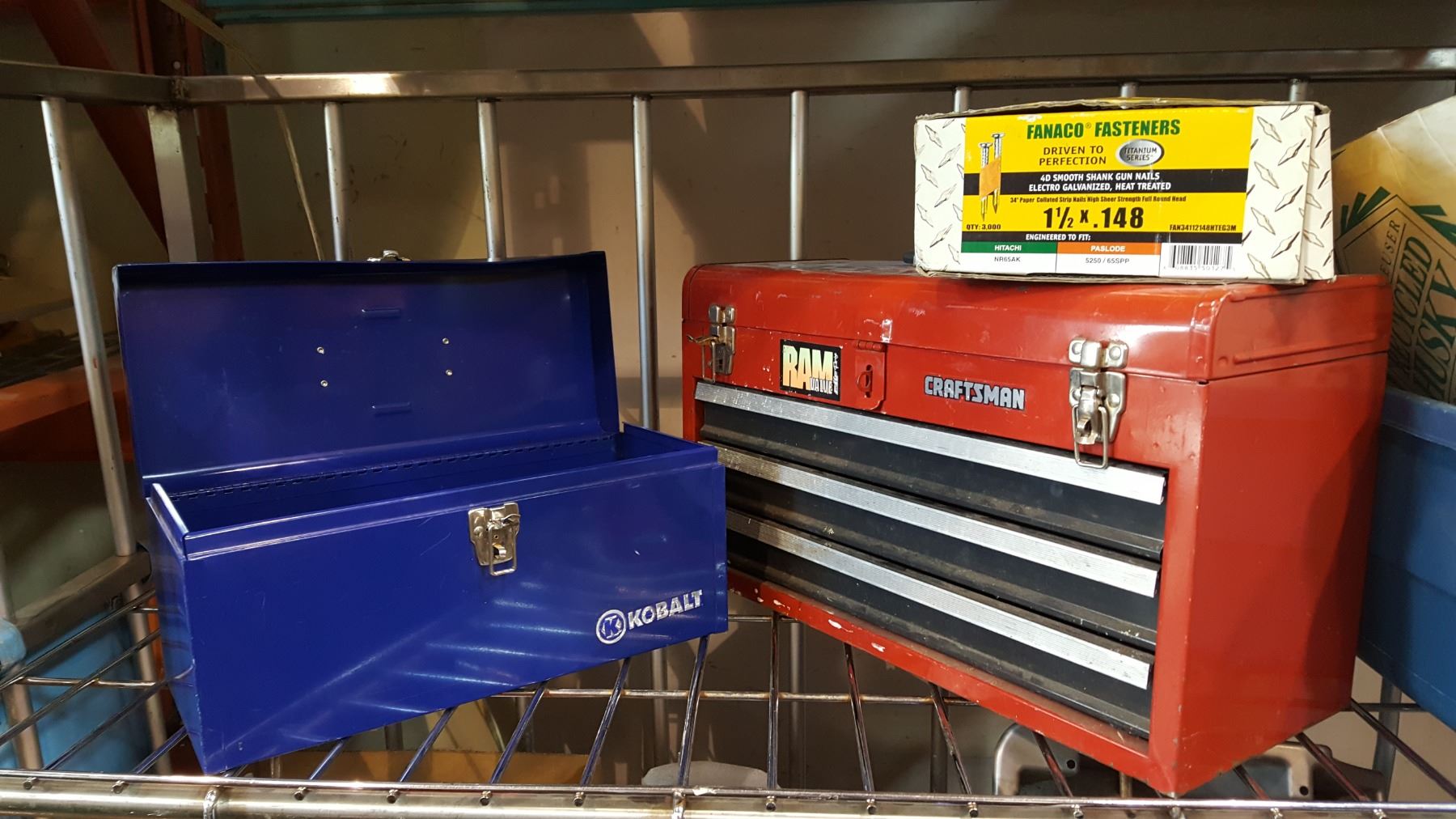 BLUE KOBALT TOOLBOX FILLED W/ SOCKETS AND RED TOOLBOX AND BOX OF STRIP NAILS