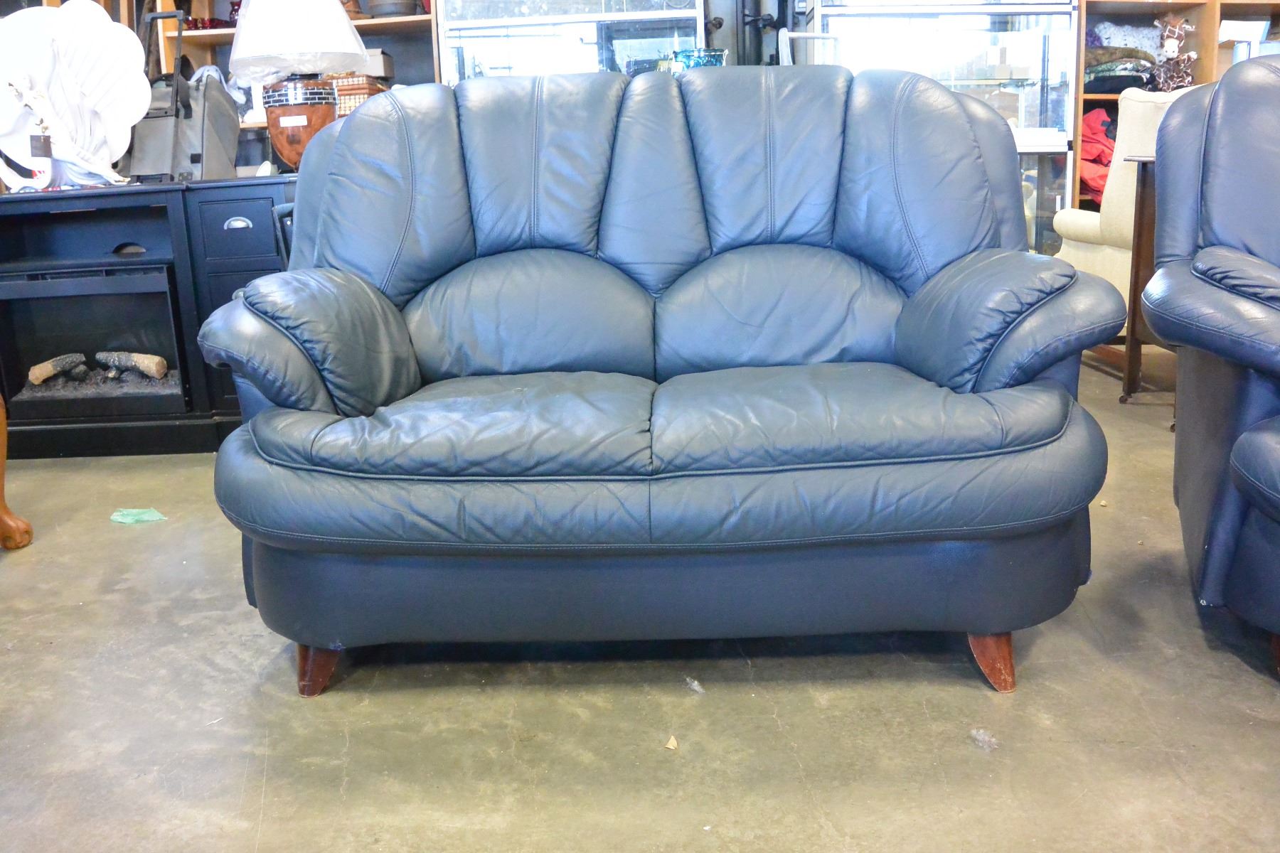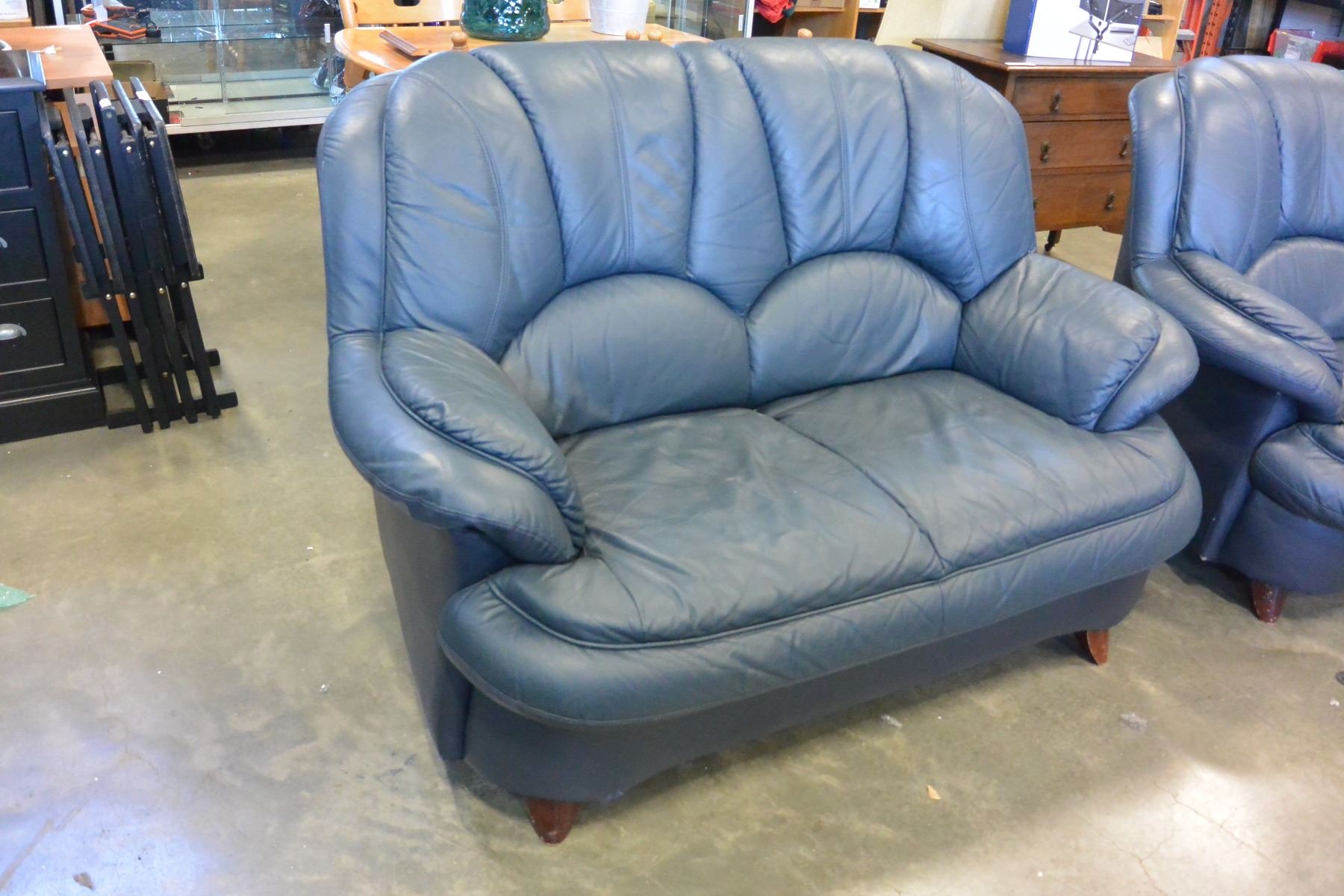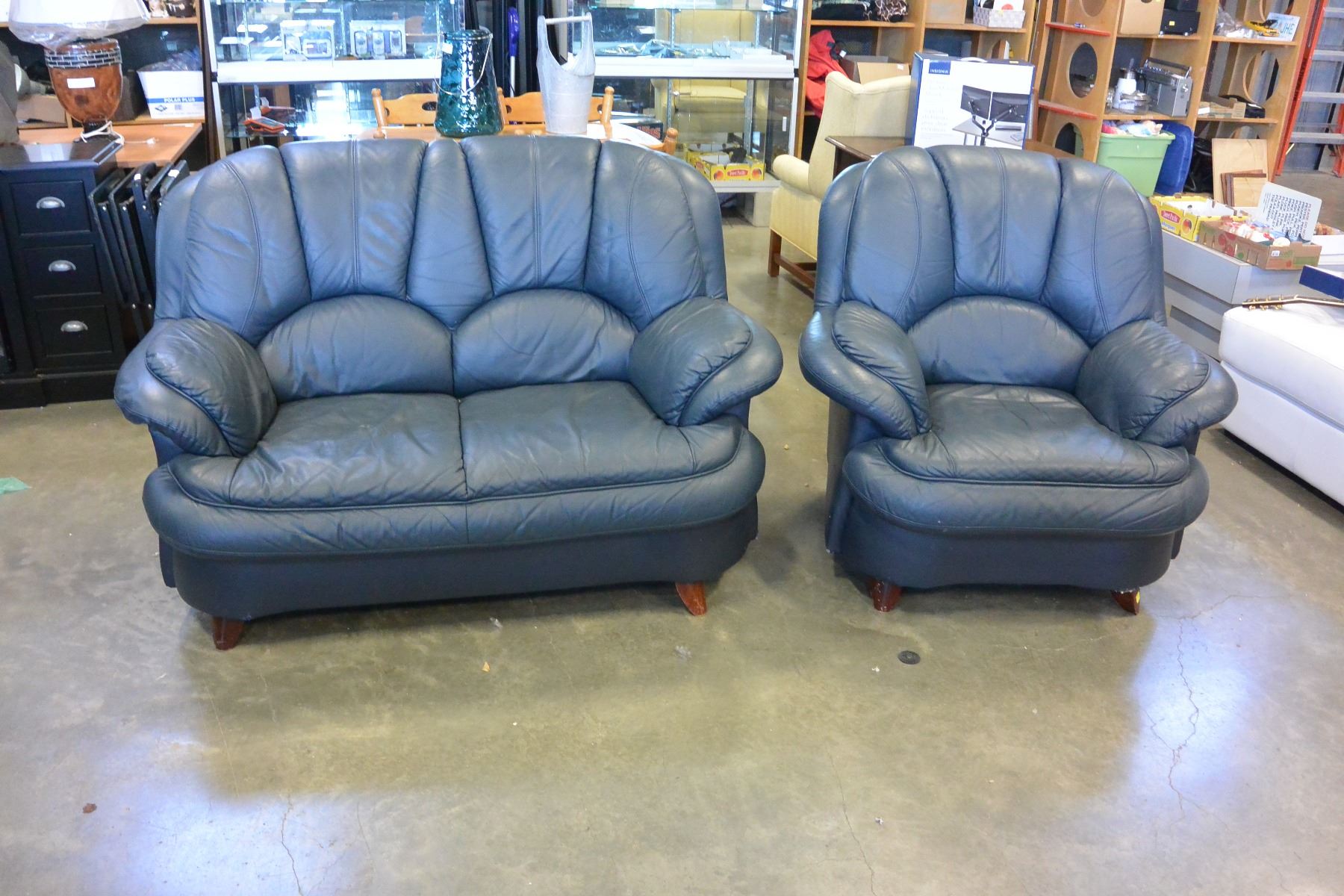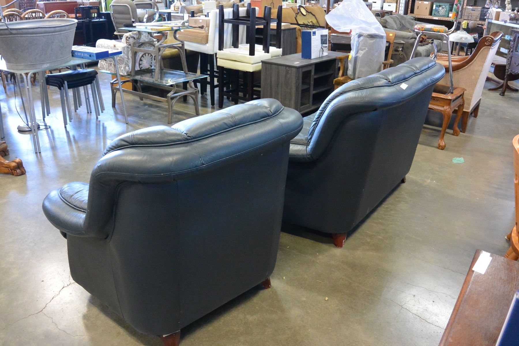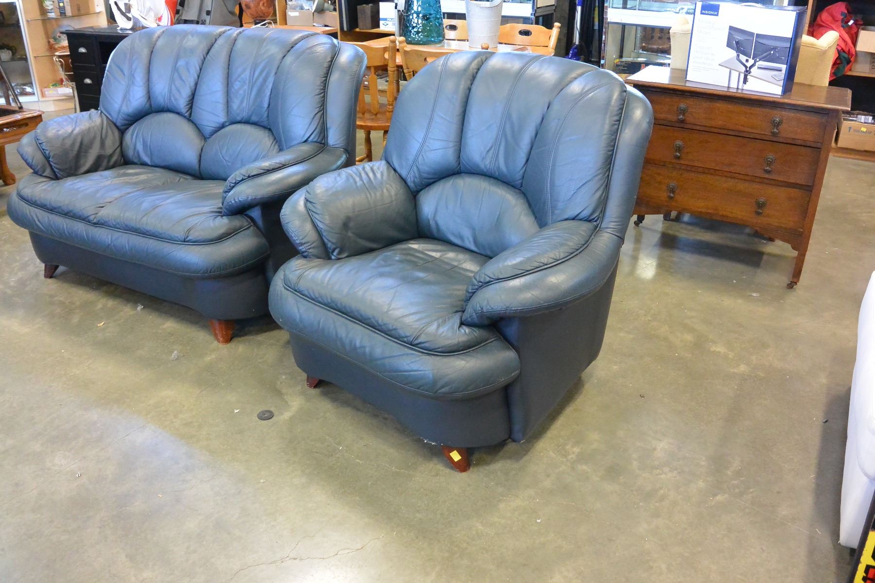 BLUE LEATHER LOVE SEAT AND ARMCHAIR