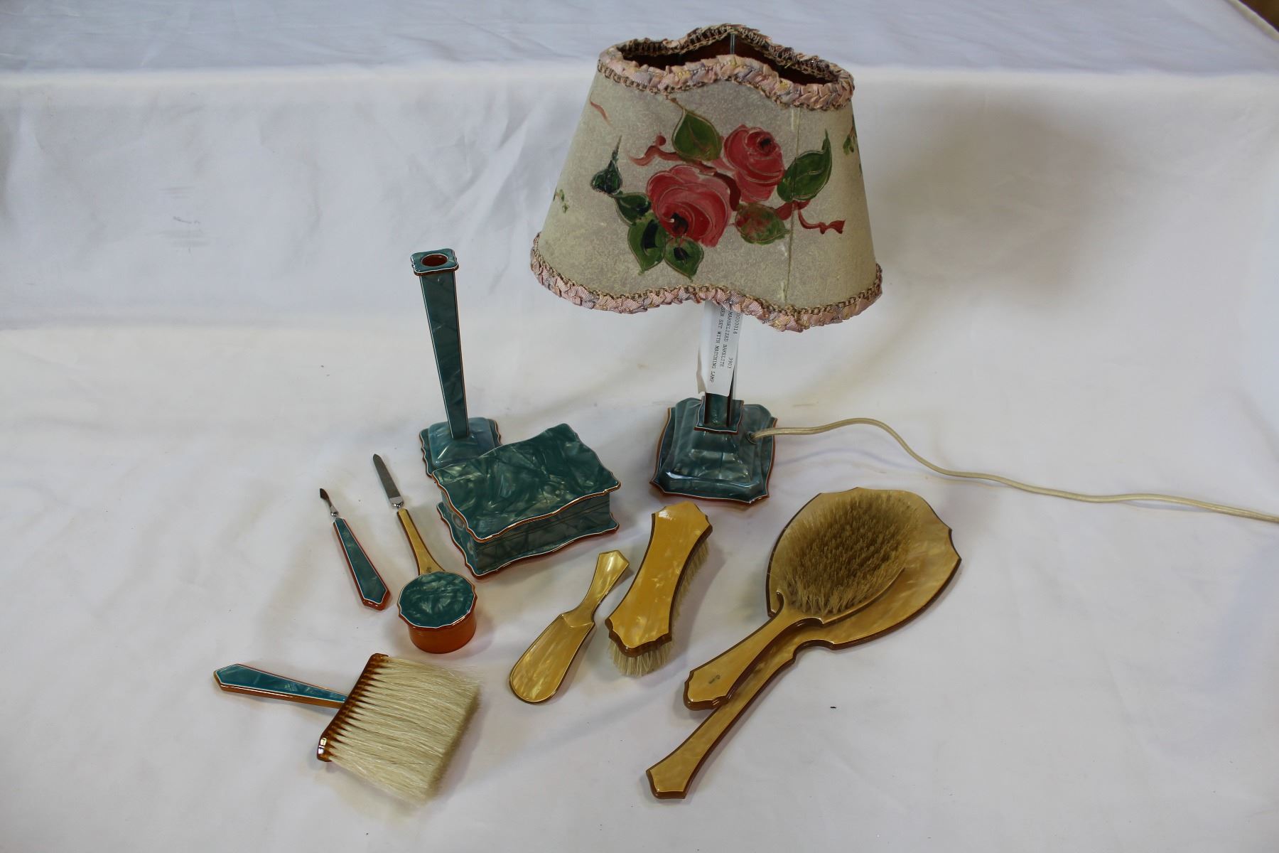BLUE MARBELIZED BAKELITE DRESSER SET WITH MATCHING LAMP