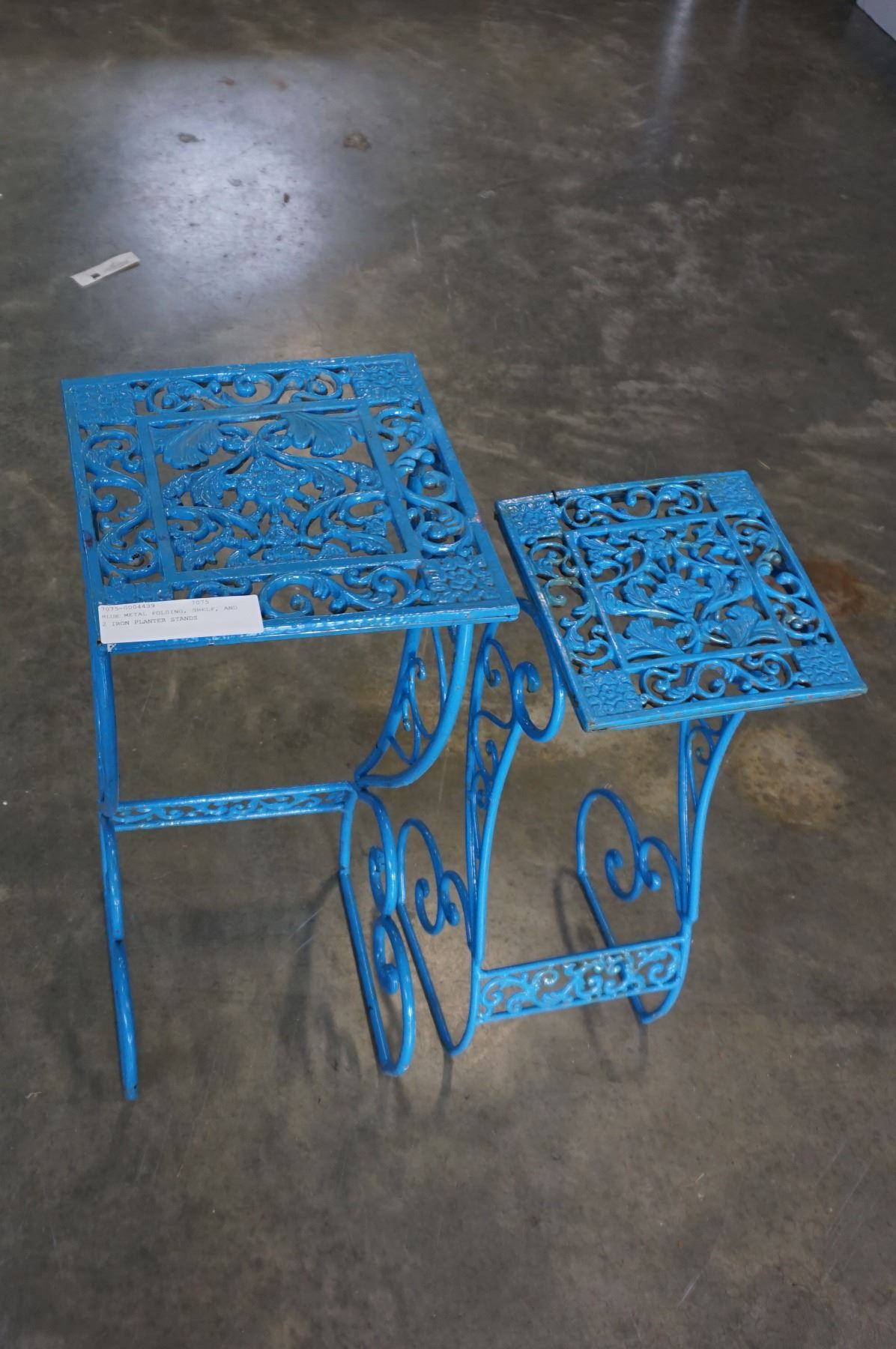 BLUE METAL FOLDING, SHELF, AND 2 IRON PLANTER STANDS