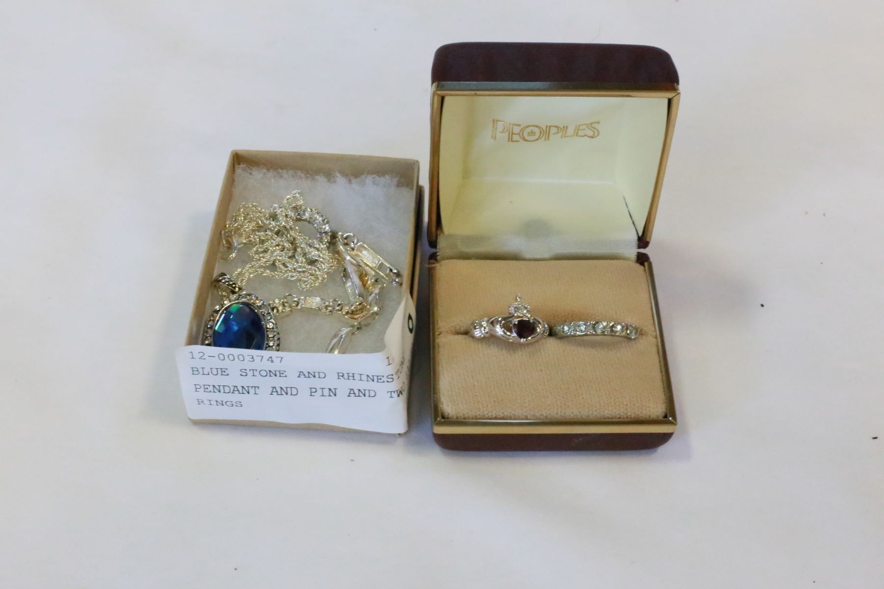 BLUE STONE AND RHINESTONE PENDANT AND PIN AND TWO LADIES RINGS