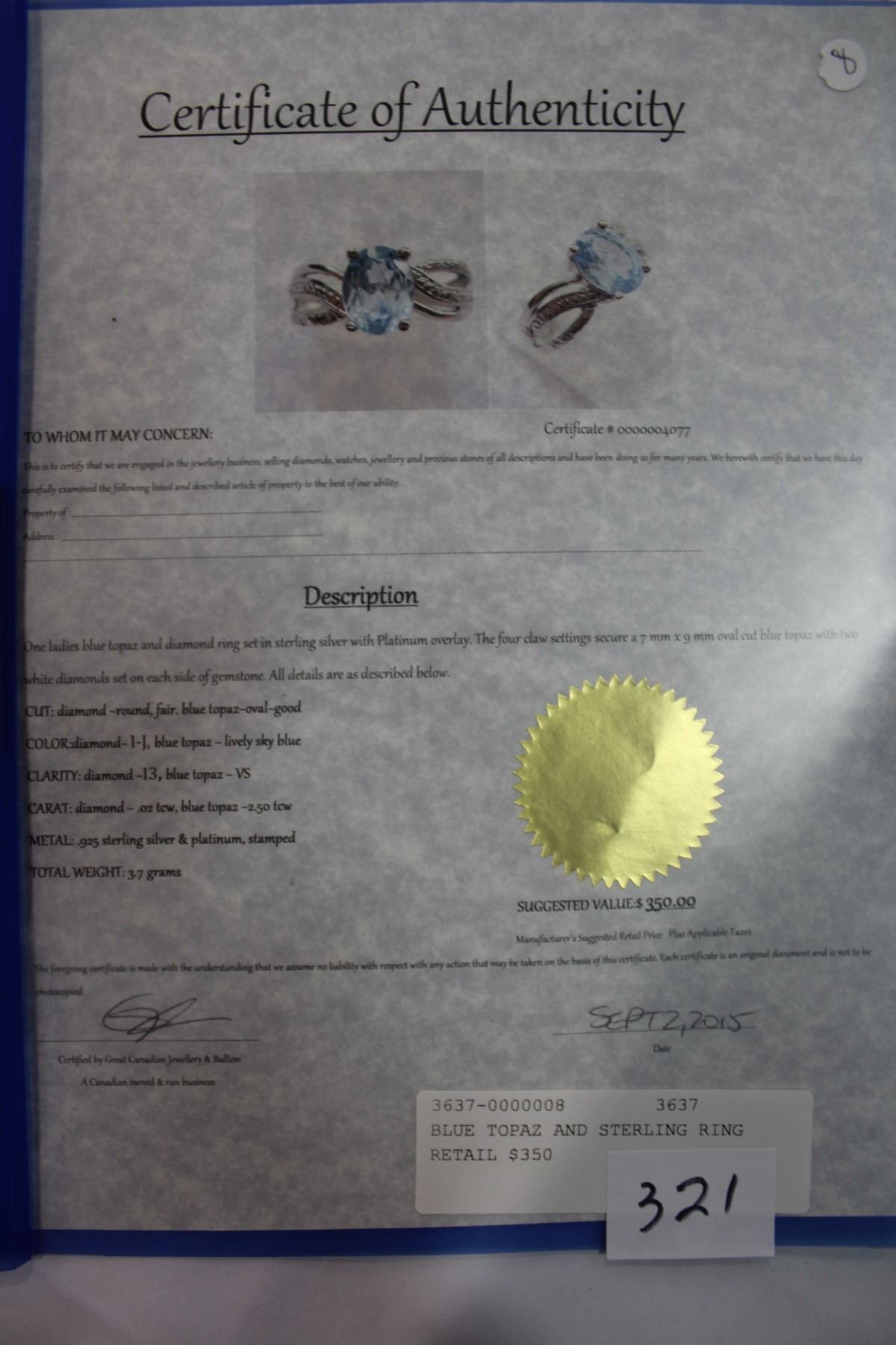 BLUE TOPAZ AND STERLING RING RETAIL $350