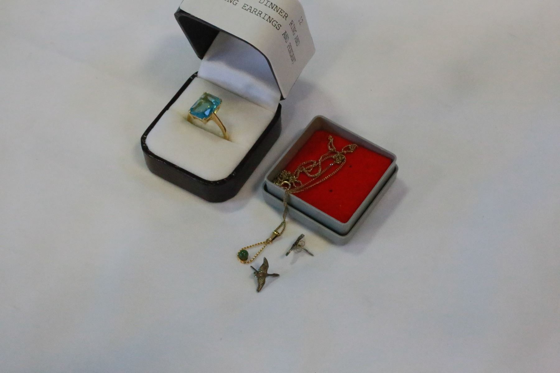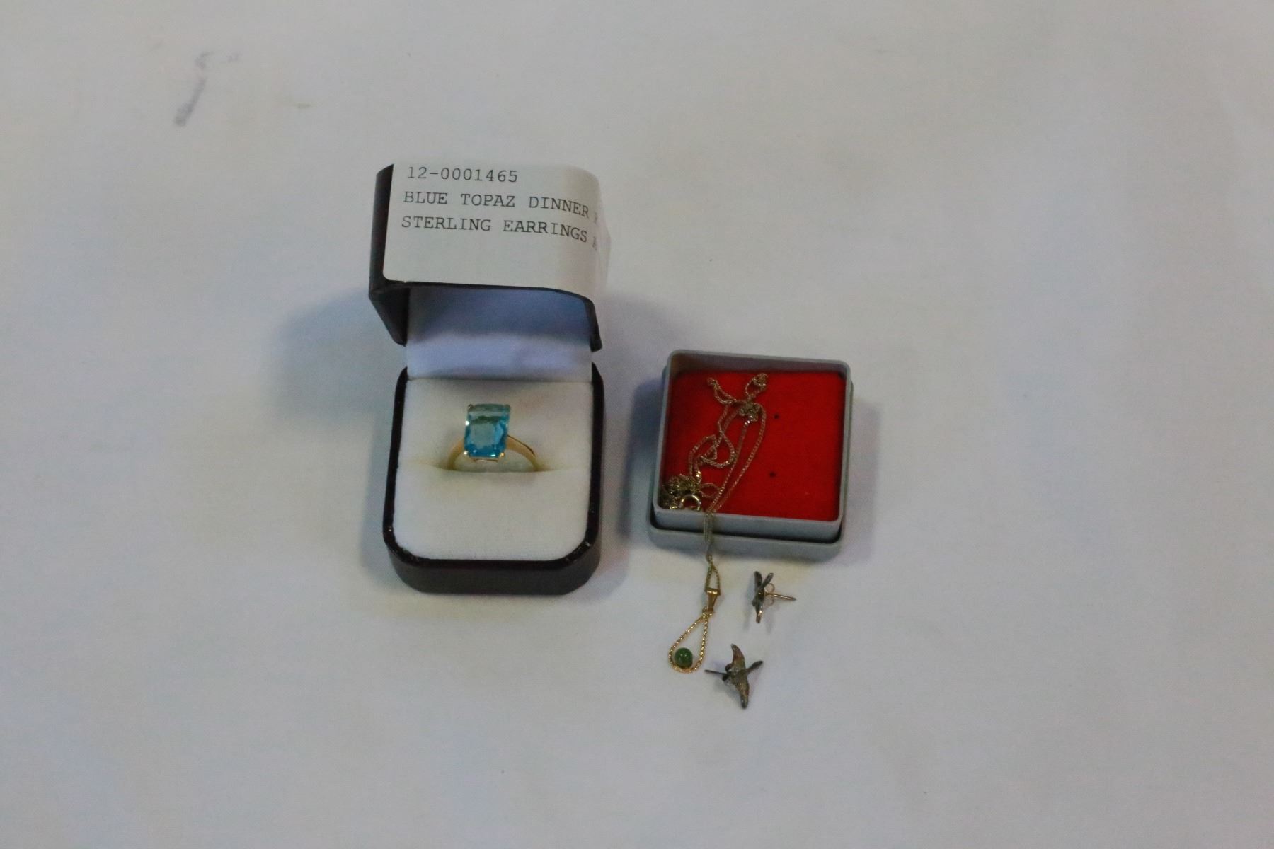 BLUE TOPAZ DINNER RING AND STERLING EARRINGS AND PENDANT
