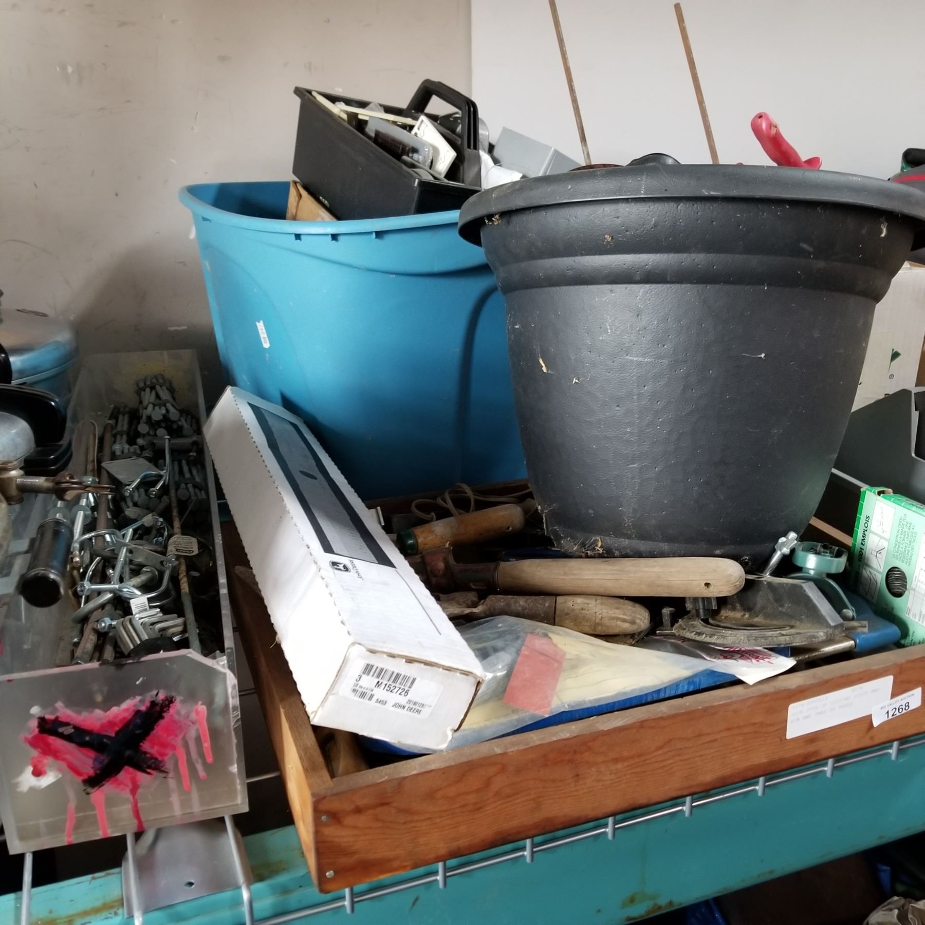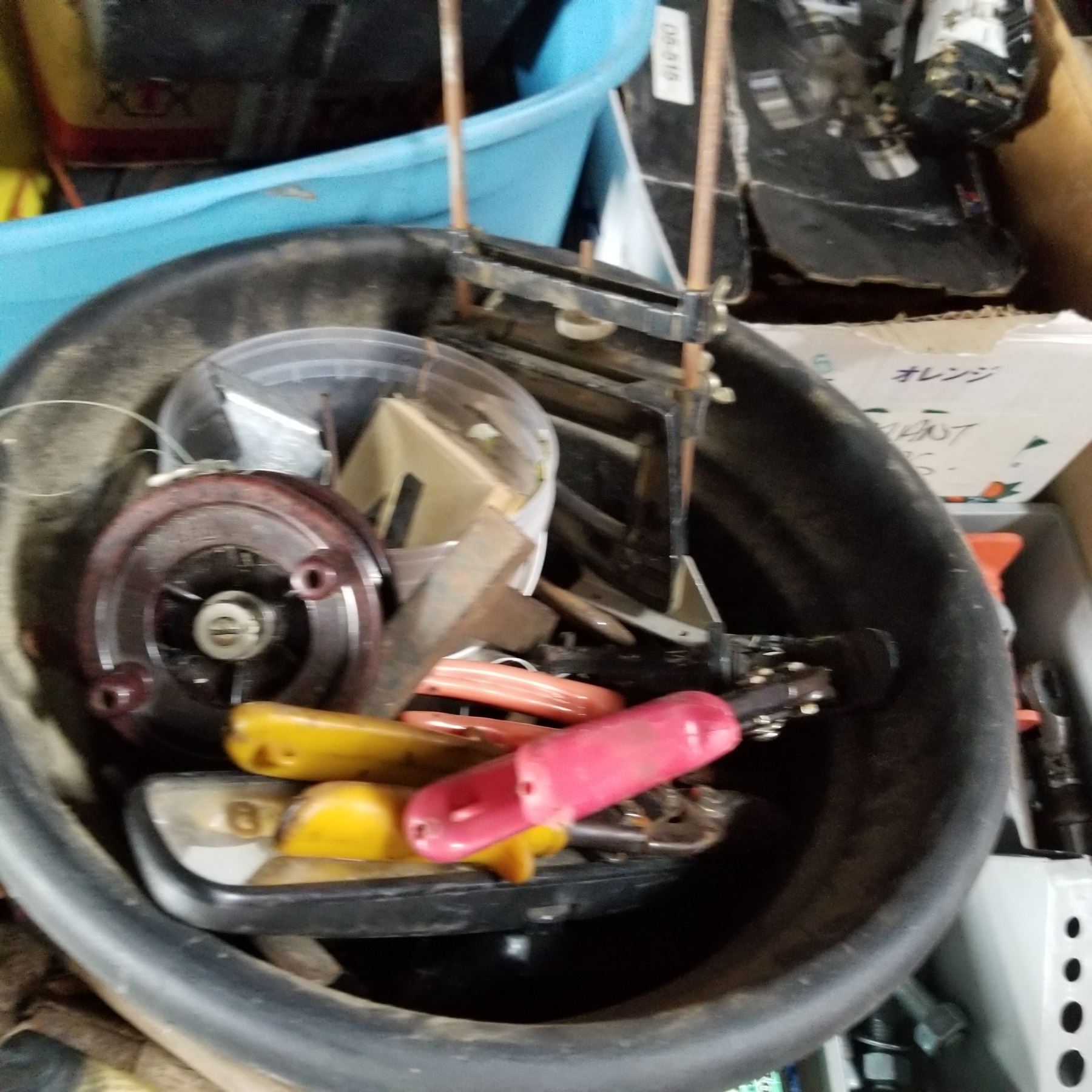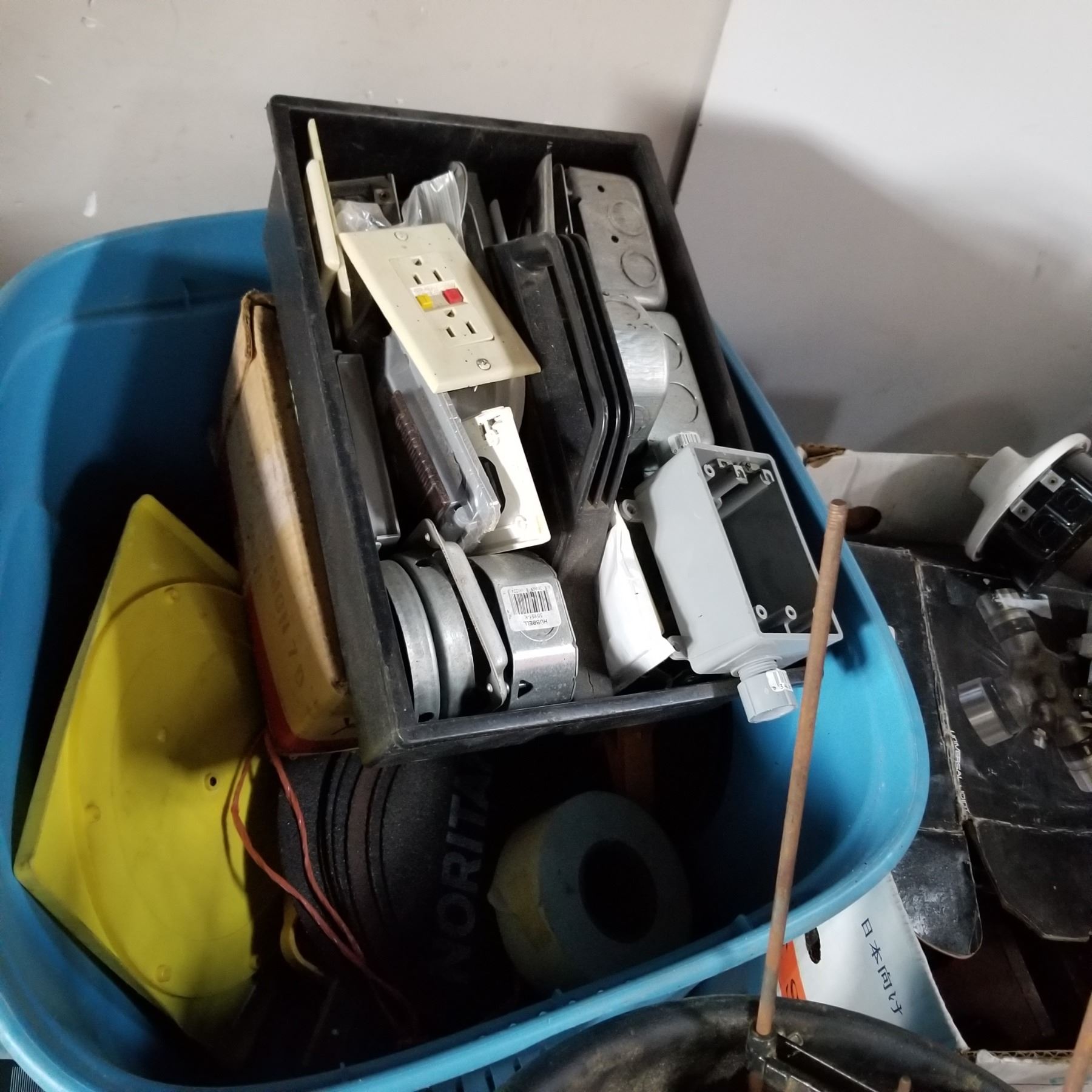 BLUE TOTE OF CUTTING DISCS AND BIN AND TRAY OF TOOLS