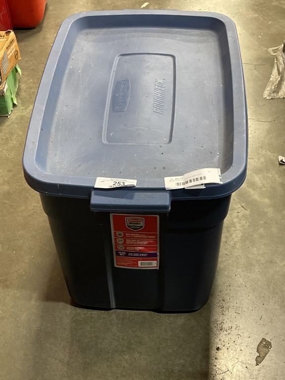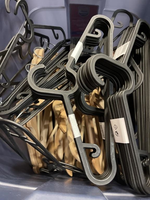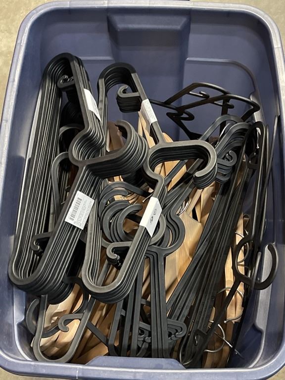BLUE TOTE W/ LID AND NEW COAT HANGERS