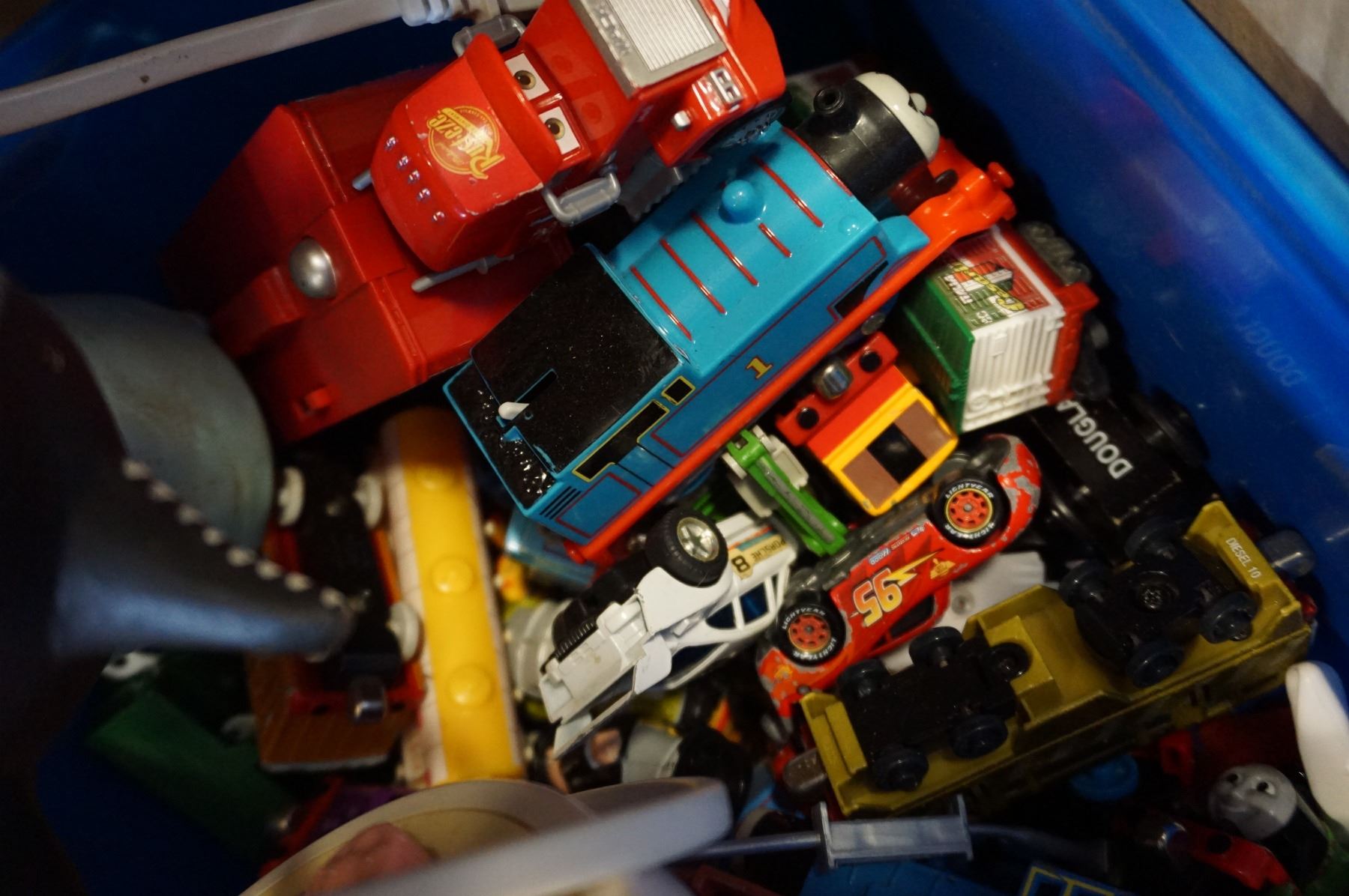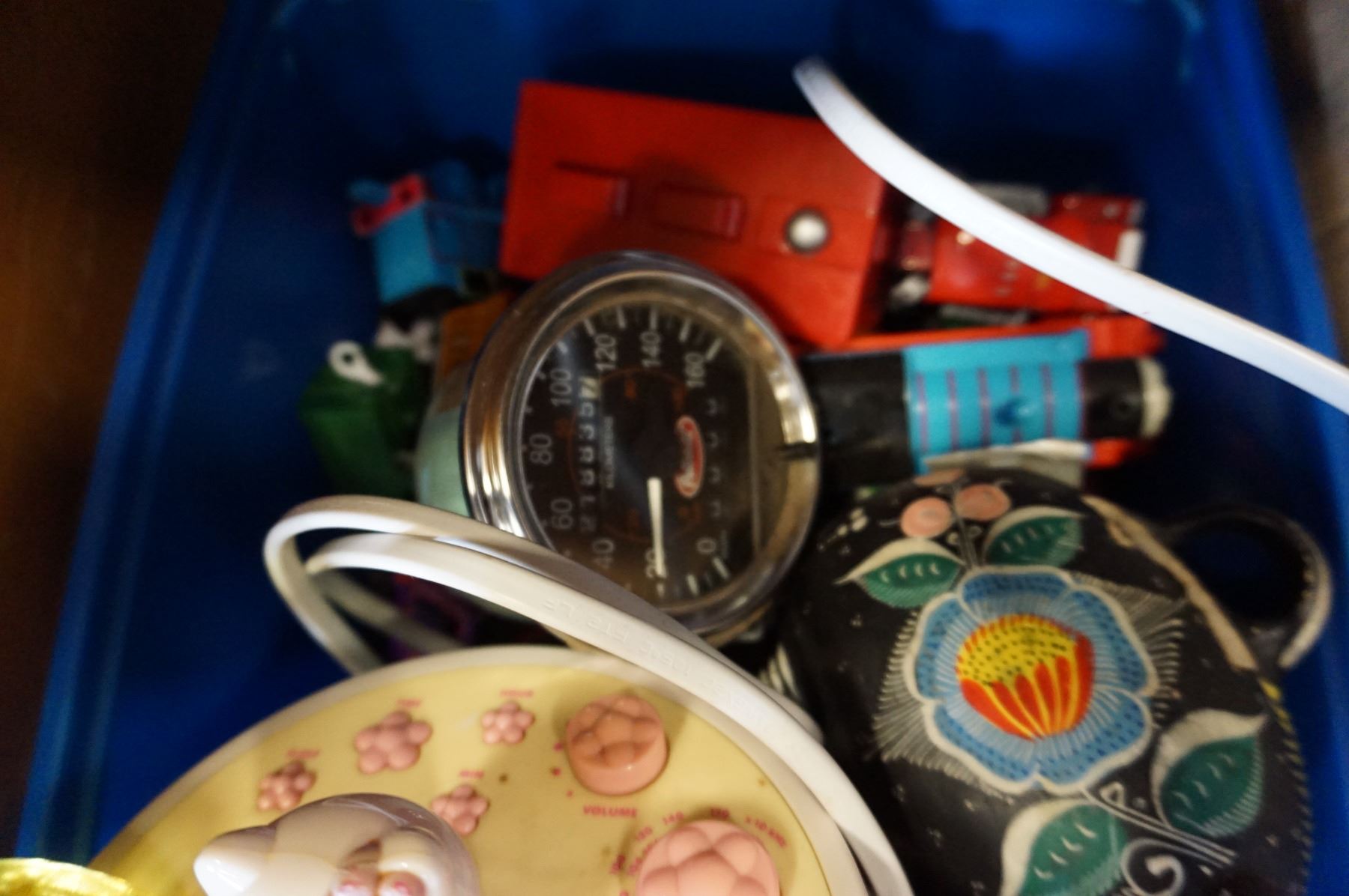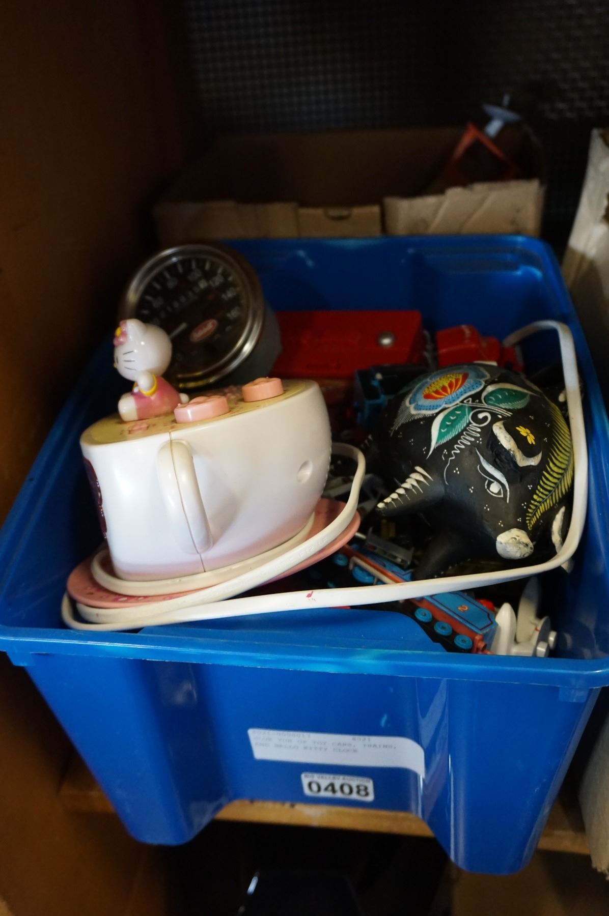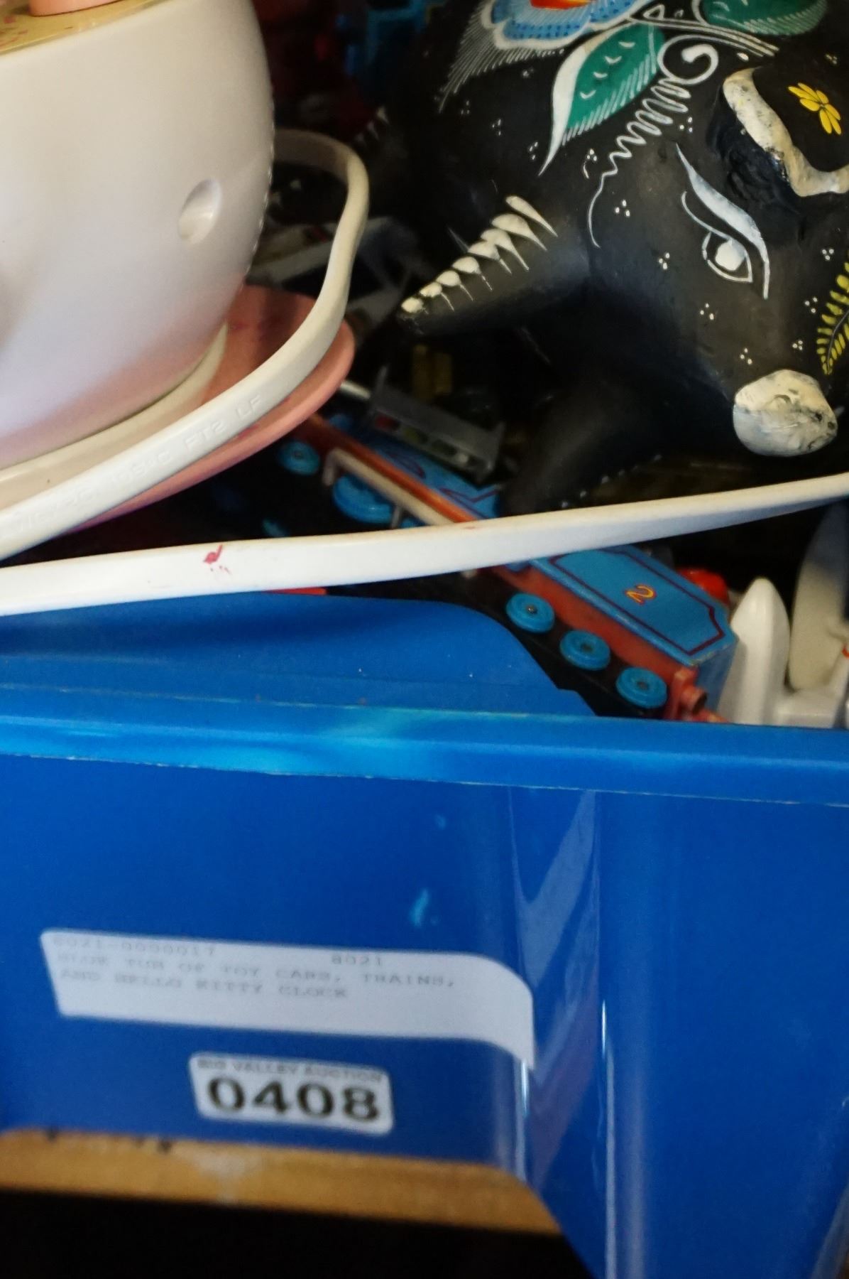 BLUE TUB OF TOY CARS, TRAINS, AND HELLO KITTY CLOCK