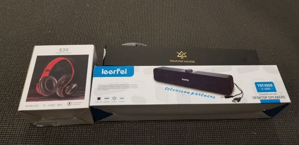 BLUETOOTH DESKTOP WIRELESS SPEAKERS, BLUETOOTH HEADPHONES, AND DESK PAD