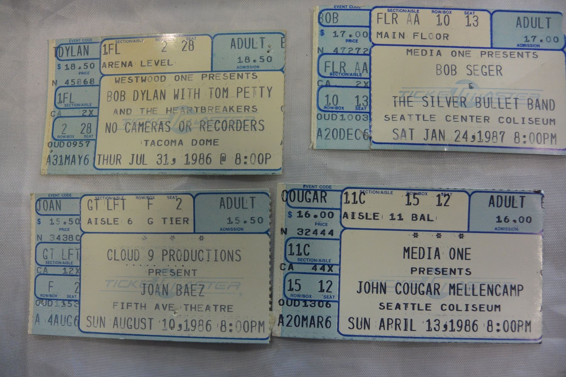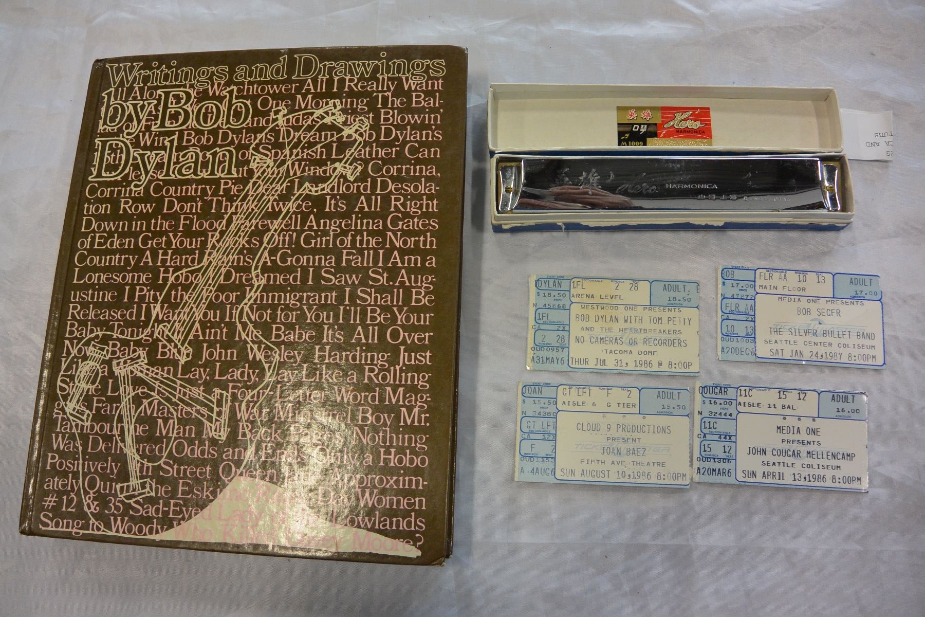 BOB DYLAN BOOK HARMONICA AND FOUR VINTAGE CONCERT STUBS