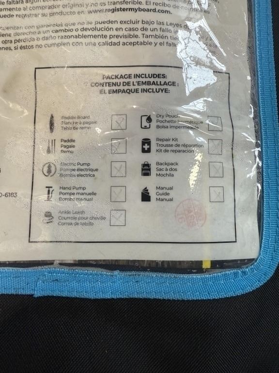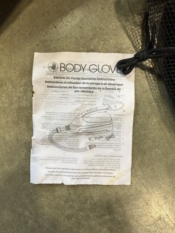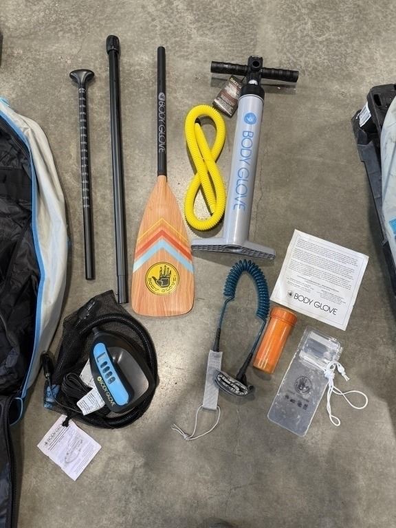 BODY GLOVE PADDLEBOARD BAG WITH ELECTRIC AND MANUAL PUMPS, PADDLE, LEASH, REPAIR KIT ETC