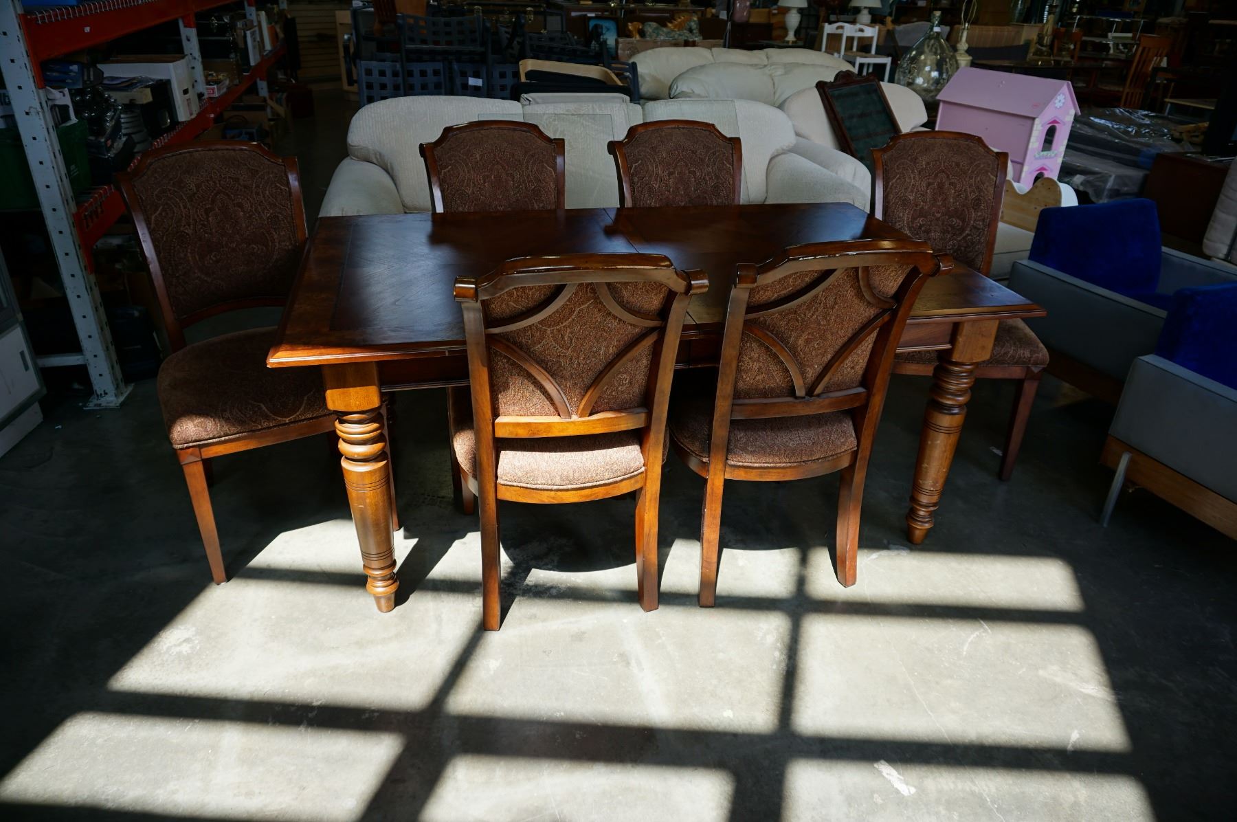 BOMBAY CONTEMPORARY DINING TABLE W/ 6 UPHOLSTERED CHAIRS W/ TABLE COVER AND EXTENSION