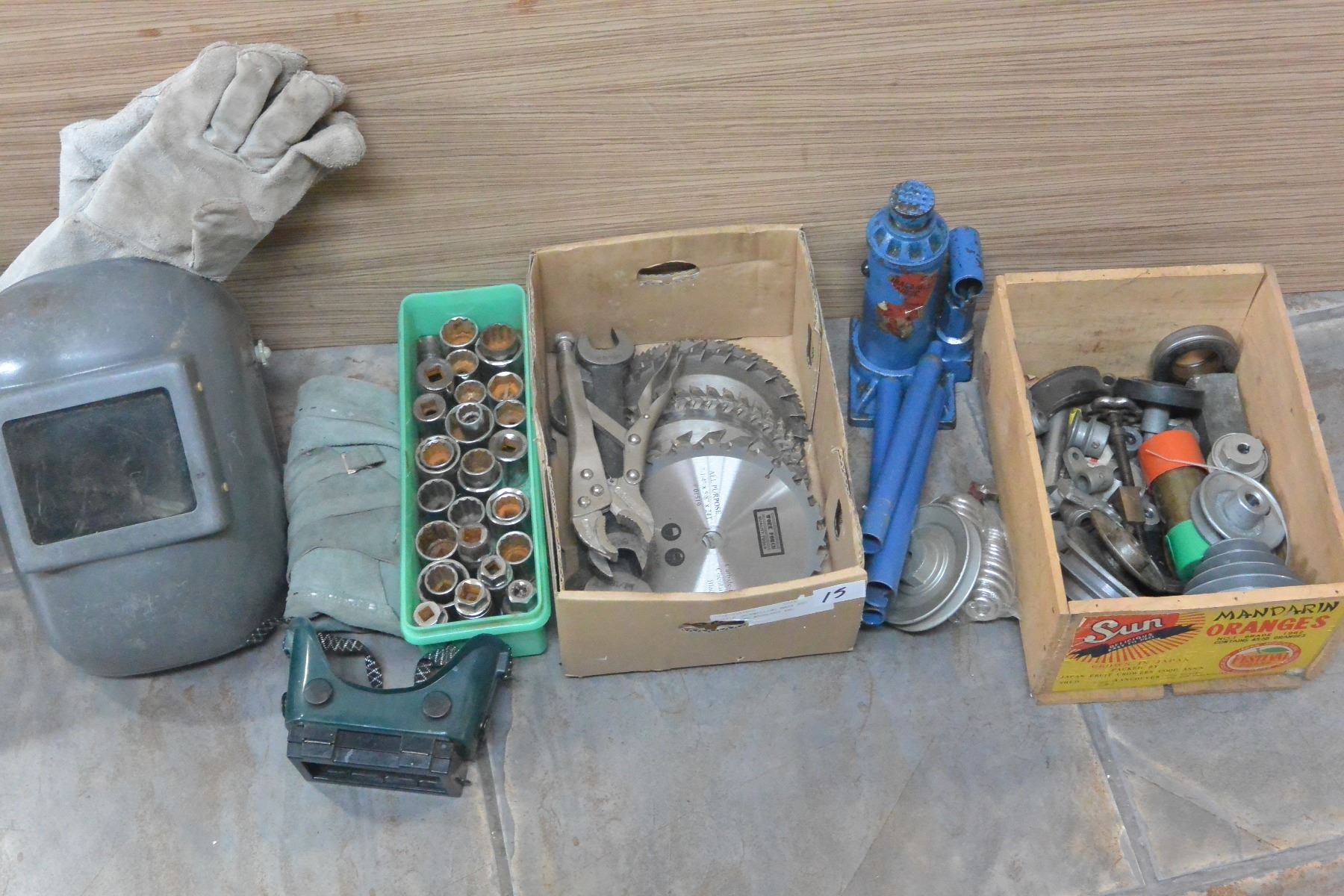 BOTTLE JACKWELDING MASK AND GLOVES AND WRENCHES AND SOCKETS