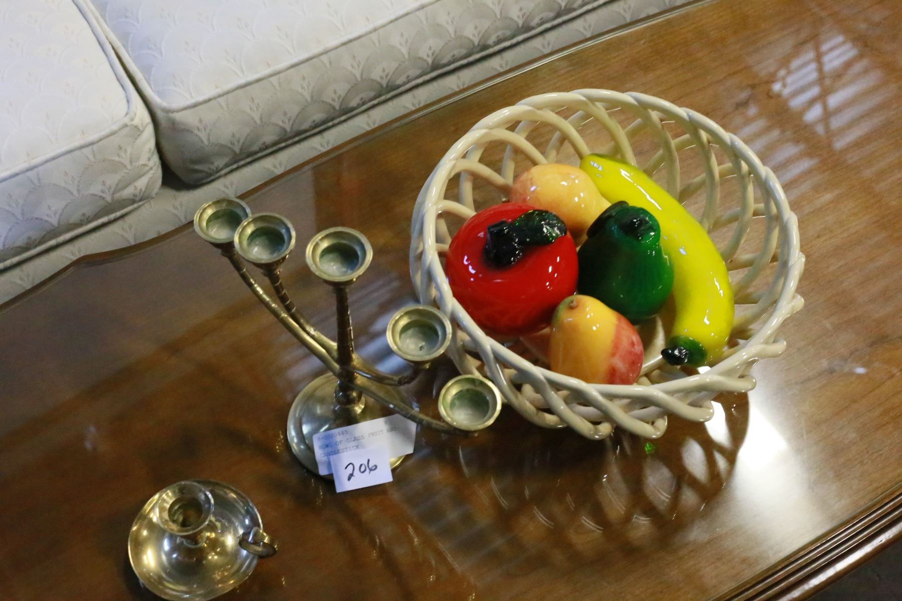 BOWL OF GLASS FRUIT AND CANDLESTICK