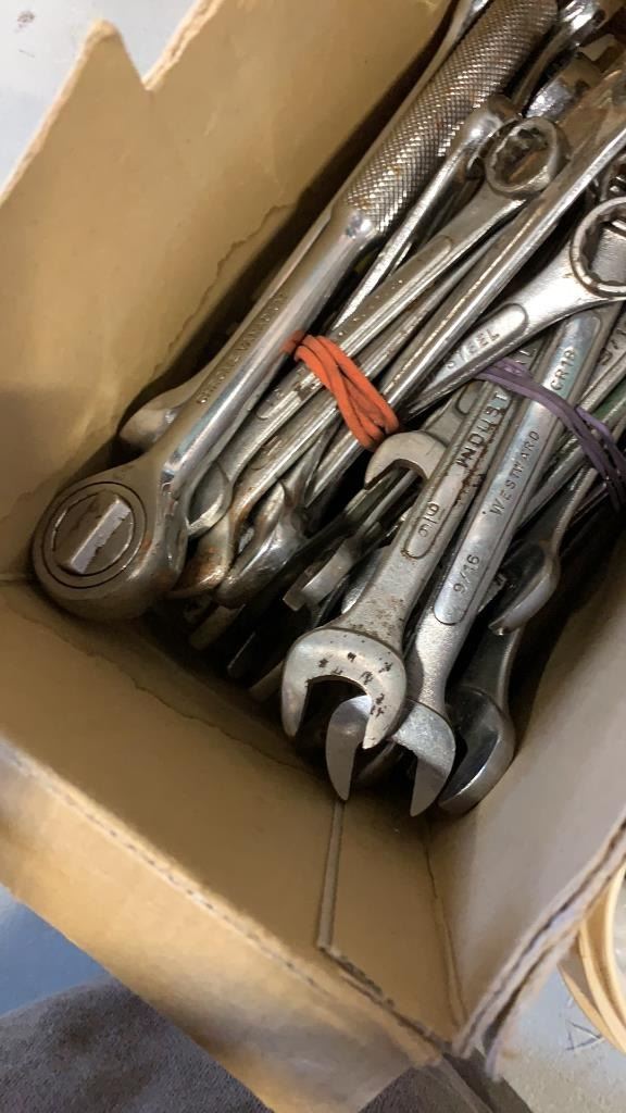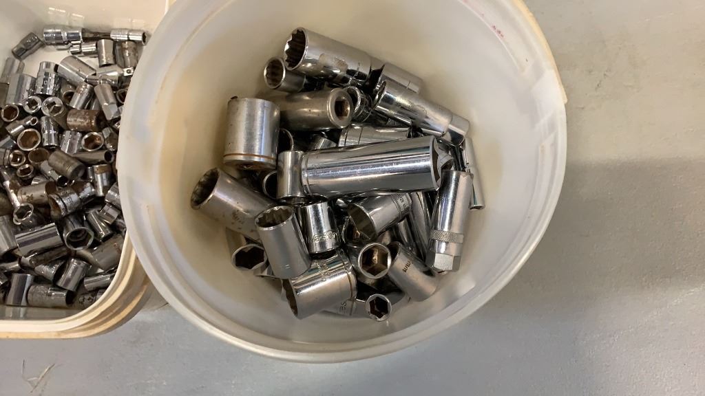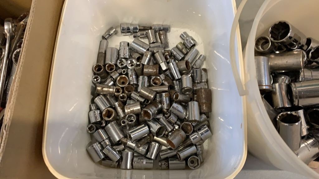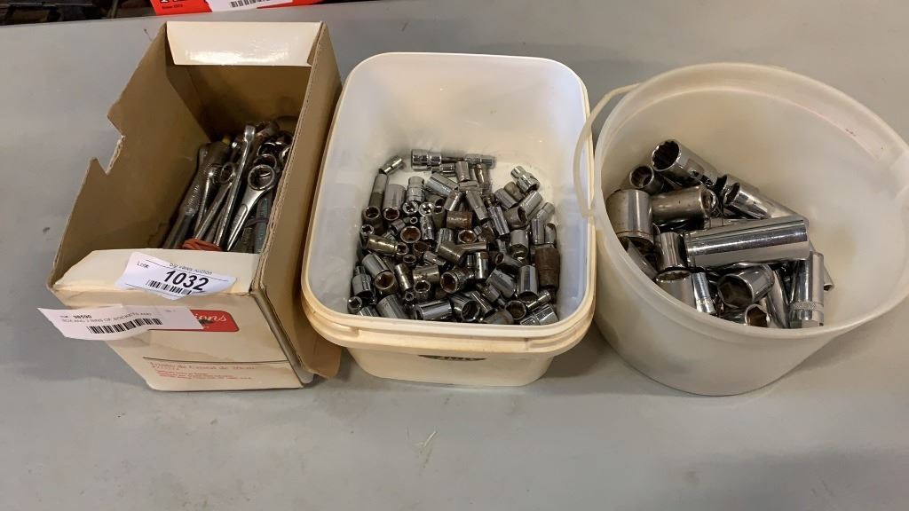 BOX AND 2 BINS OF SOCKETS AND WRENCHES