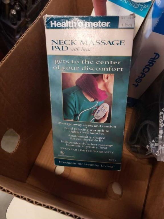 BOX AND 2 TRAYS OF PLANTER POTS, DECORATIONS, NECK MASSAGER HEAT PAD, AIR CASTS