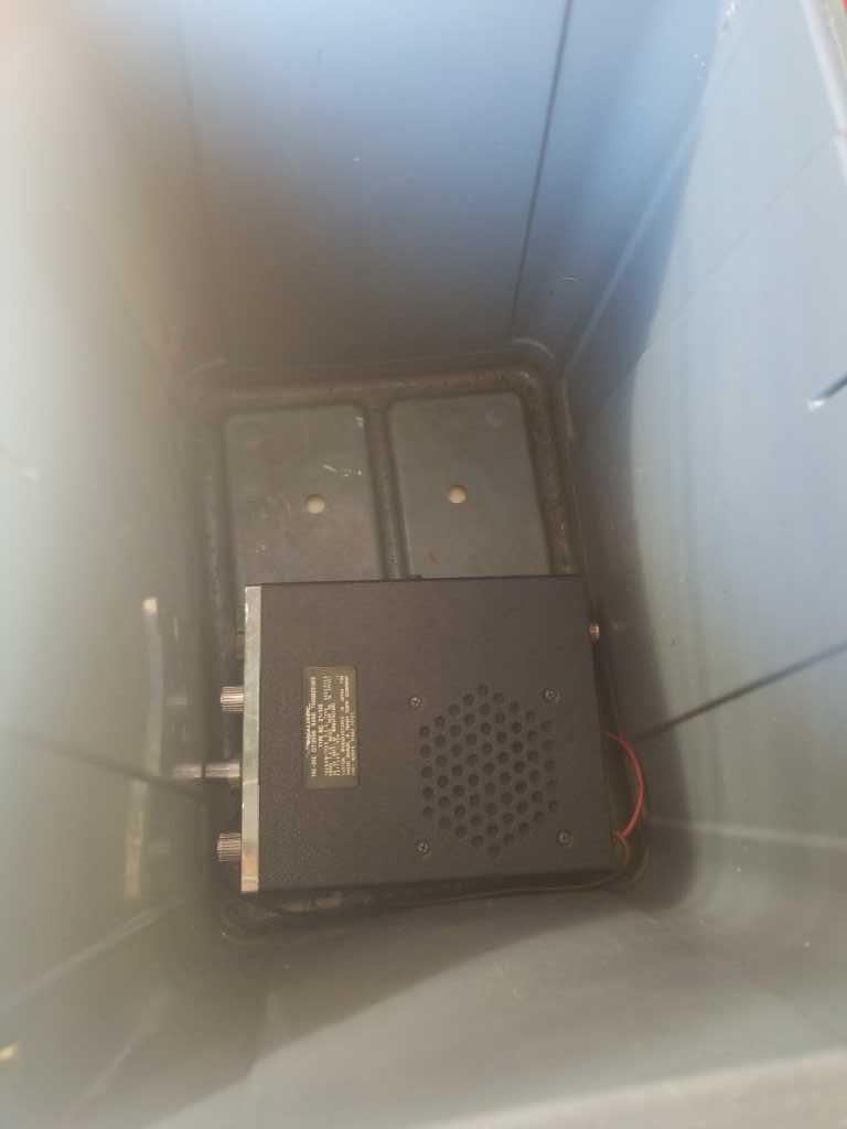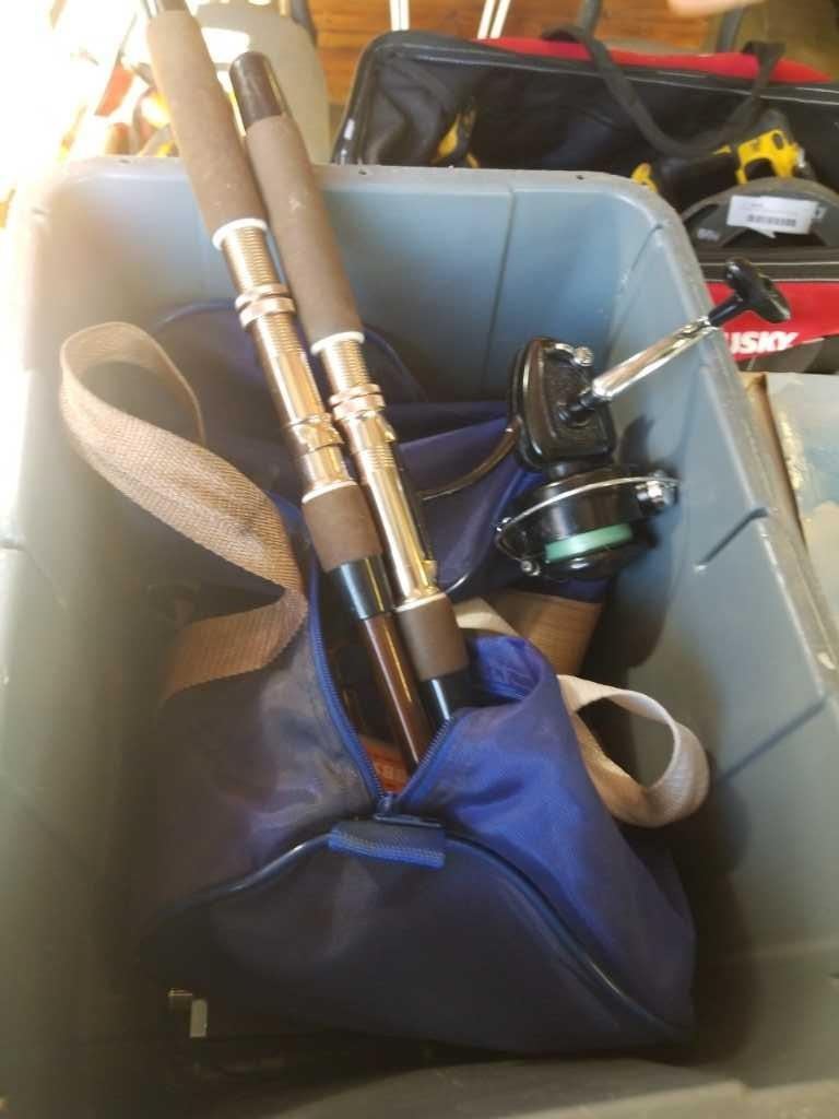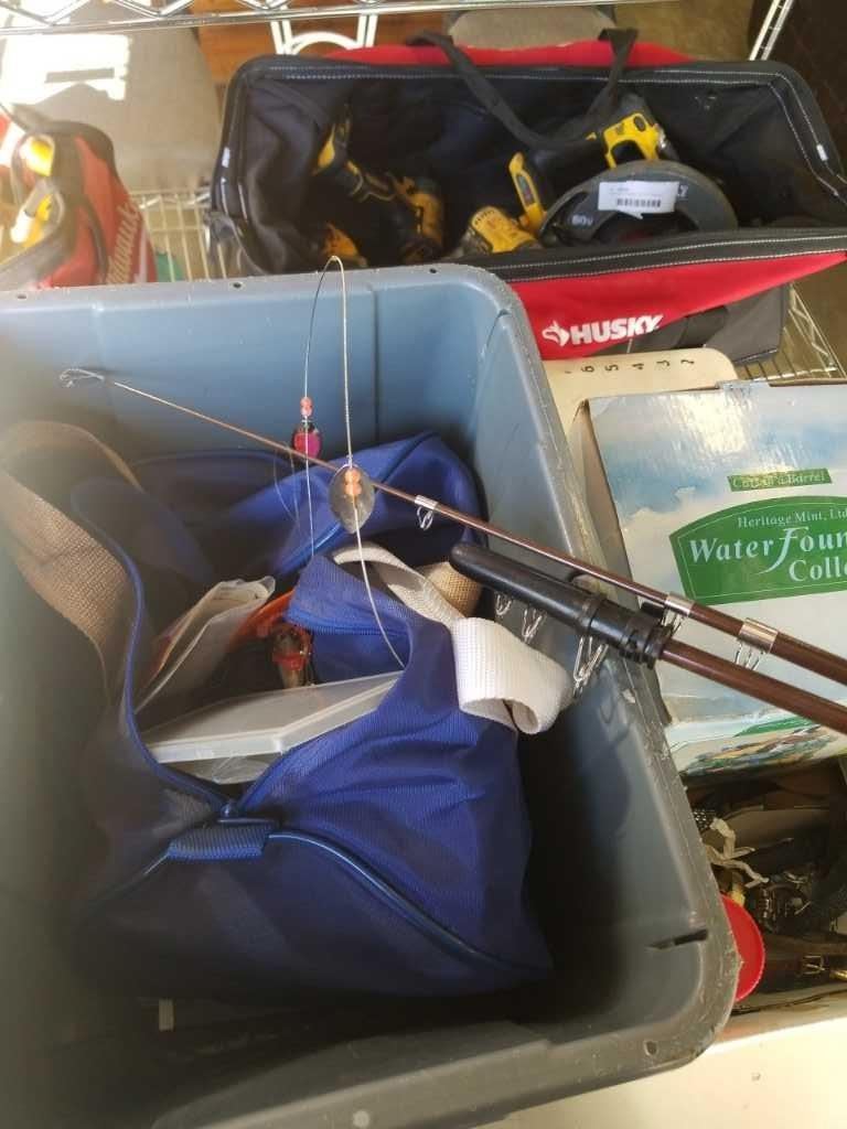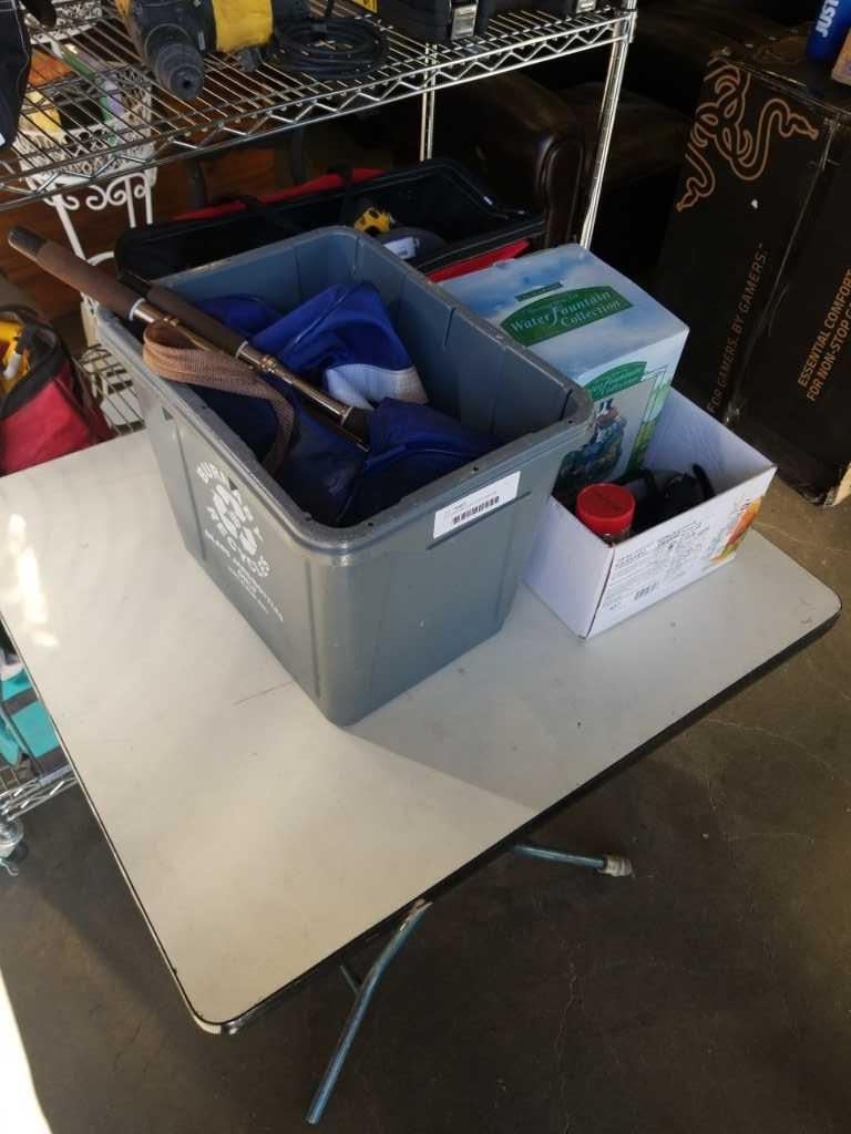 BOX AND BIN OF WATER FOUNTAIN, FISHING RODS AND MORE