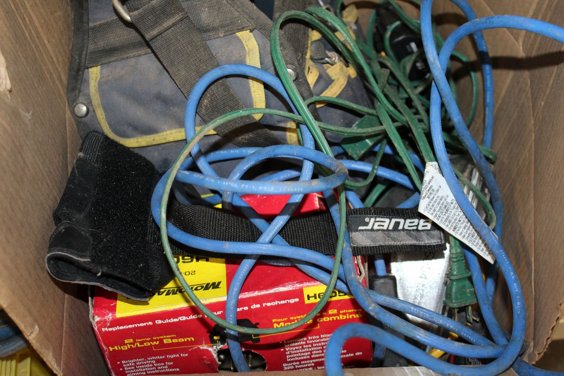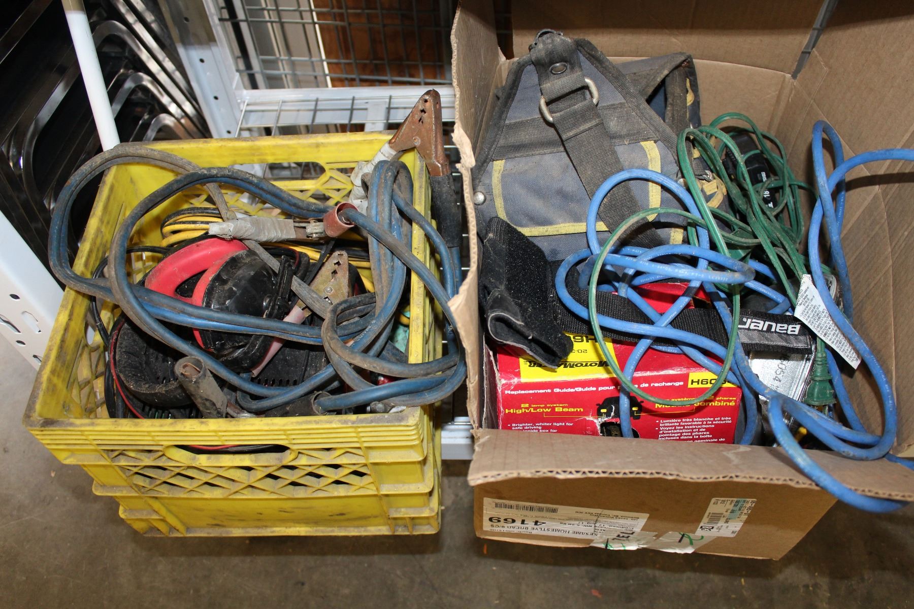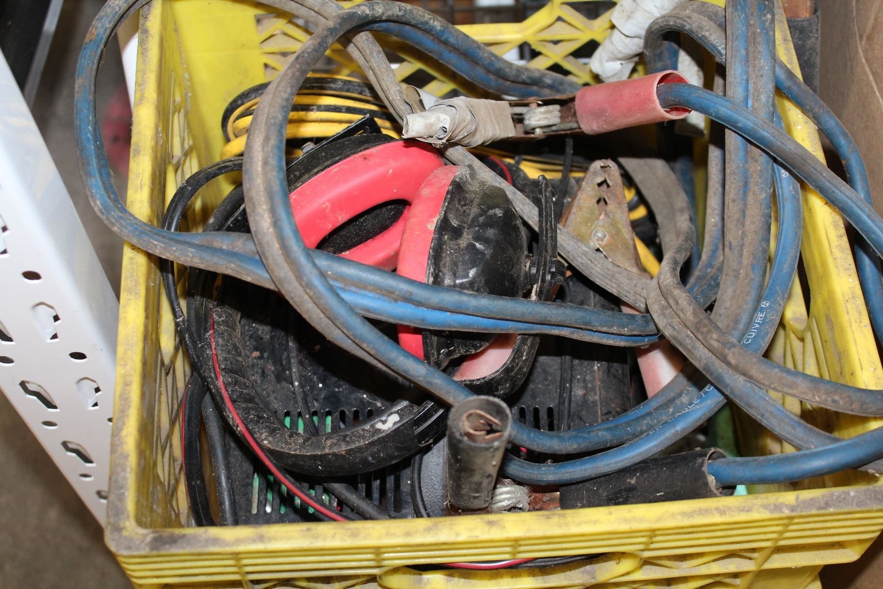 BOX AND CRATE OF TOOLS AND JUMPER CABLES