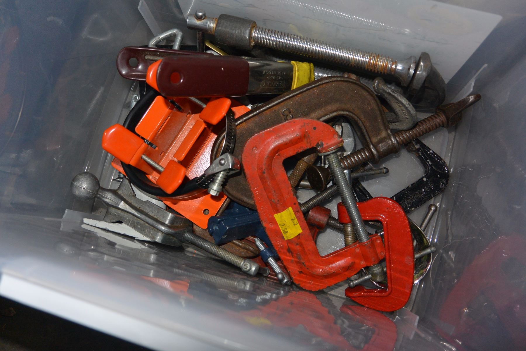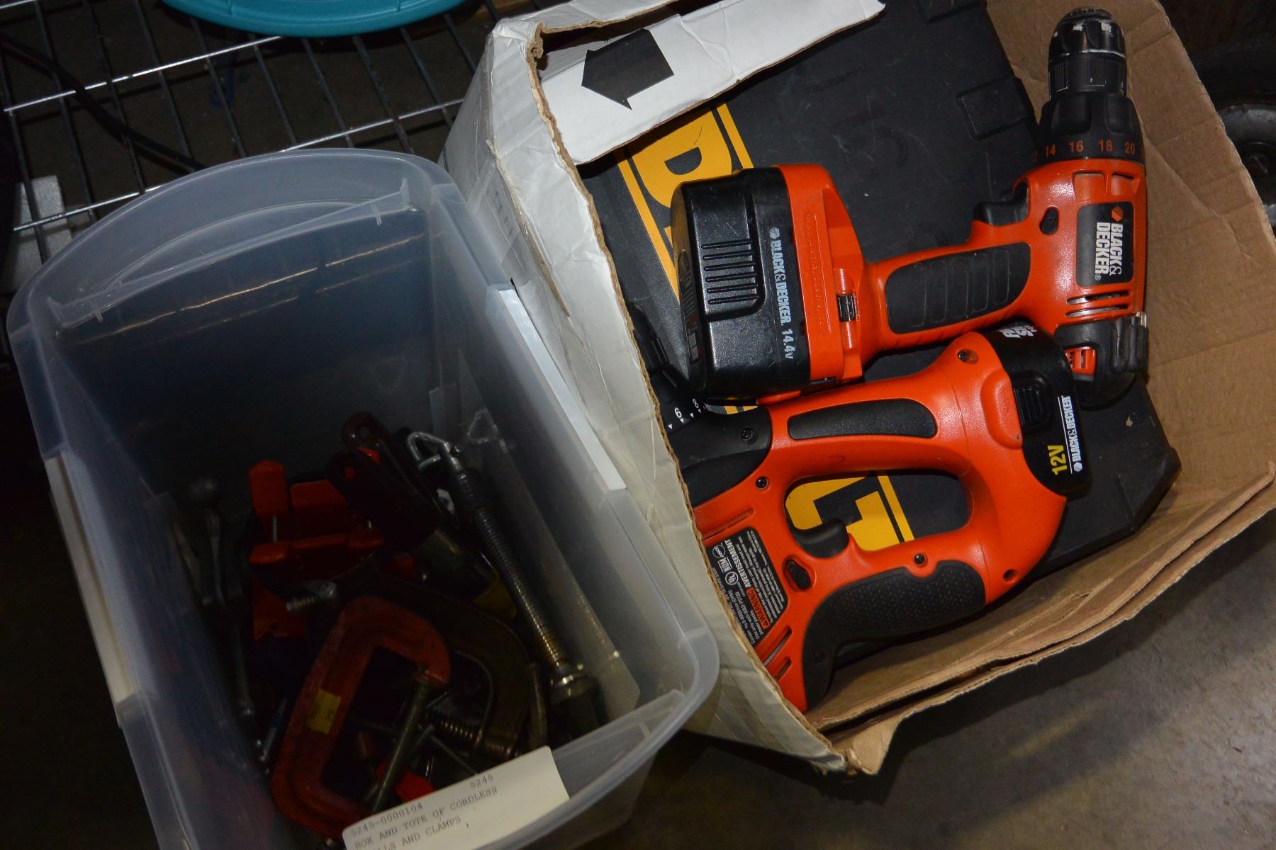 BOX AND TOTE OF CORDLESS DRILLS AND CLAMPS