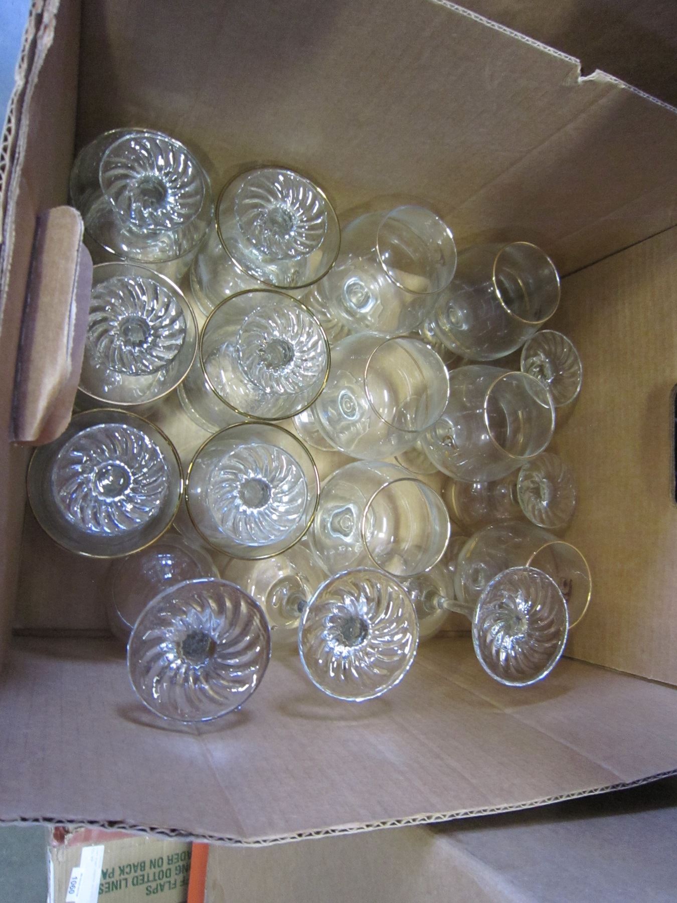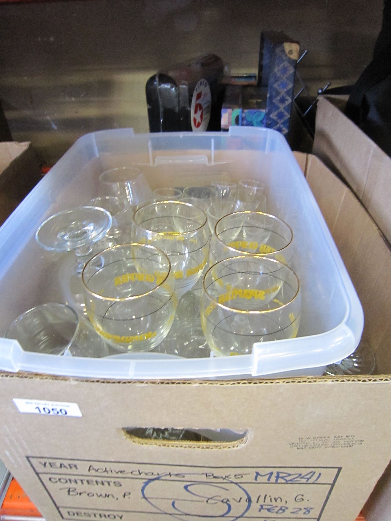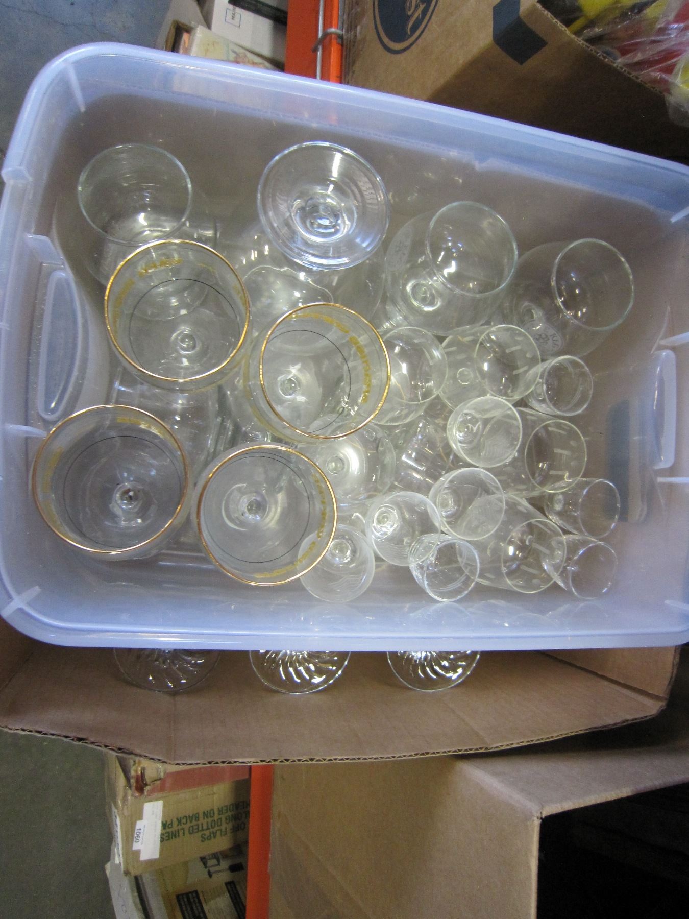 BOX AND TOTE OF CRYSTAL AND OLYMPIC GLASS CUPS W/ DECORATIVE BOXES
