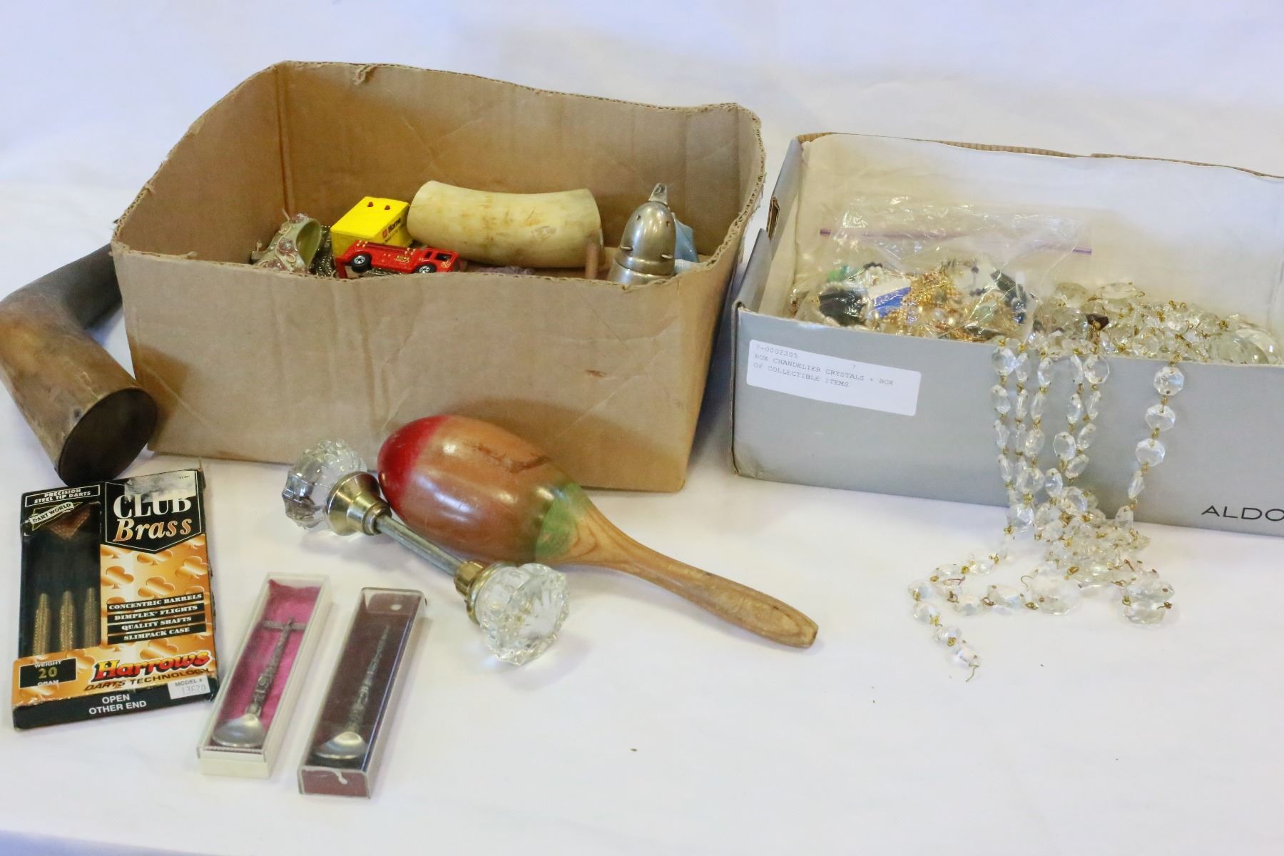 BOX CHANDELIER CRYSTALS + BOX OF COLLECTIBLE ITEMS