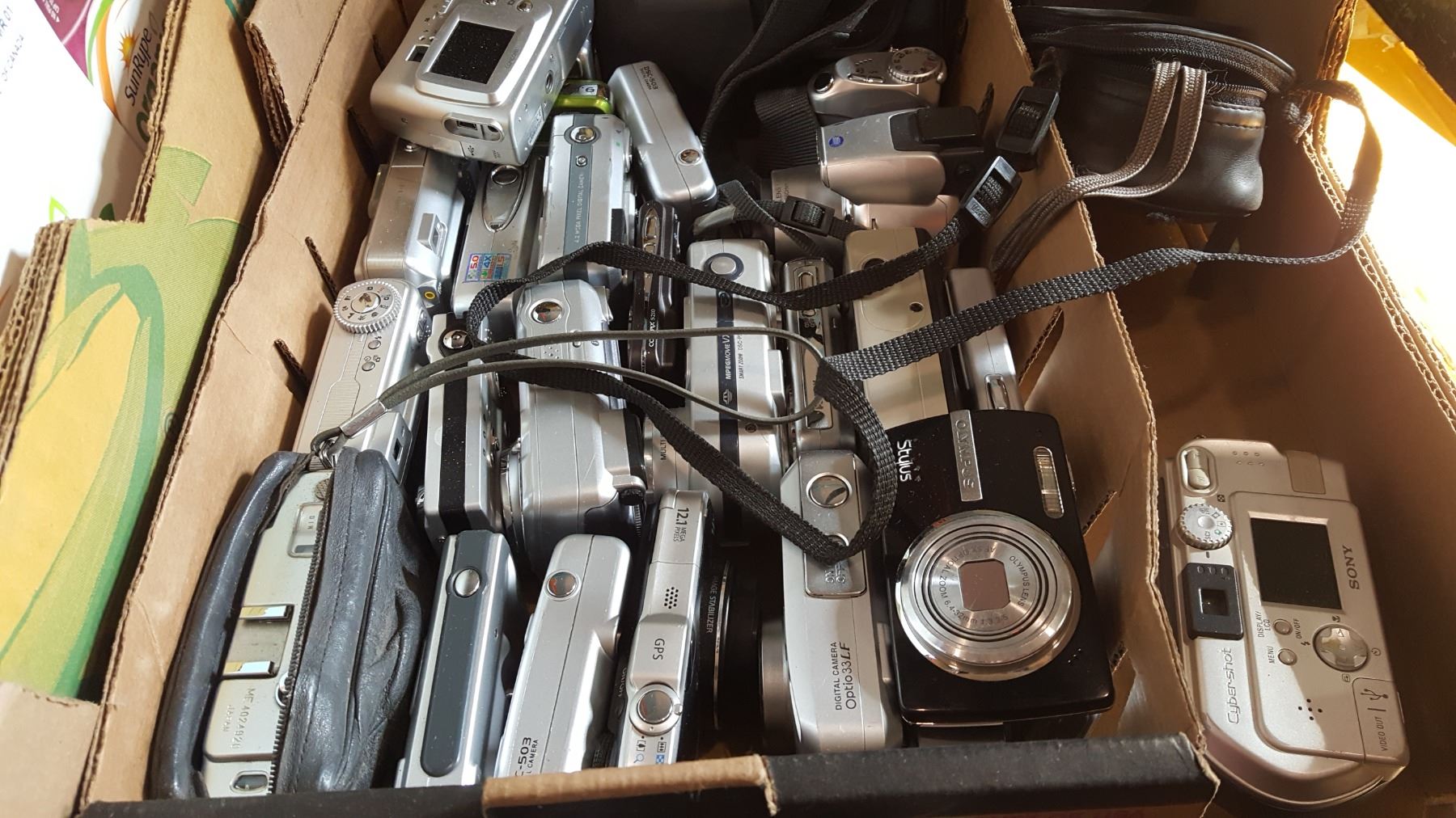 BOX LOT OF ASSORTED DIGITAL CAMERAS AND PLAYER PIANO ROLL