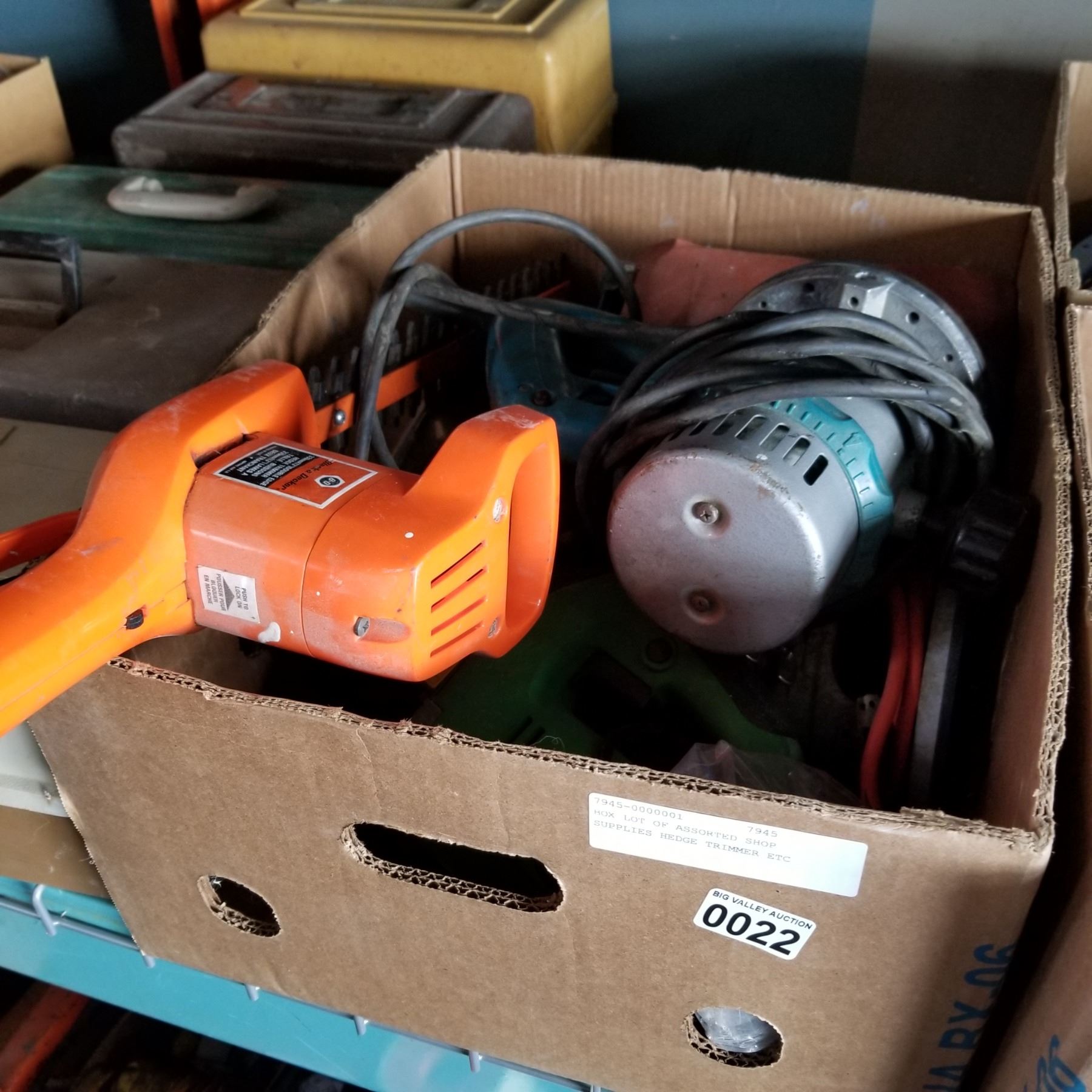 BOX LOT OF ASSORTED SHOP SUPPLIES HEDGE TRIMMER ETC