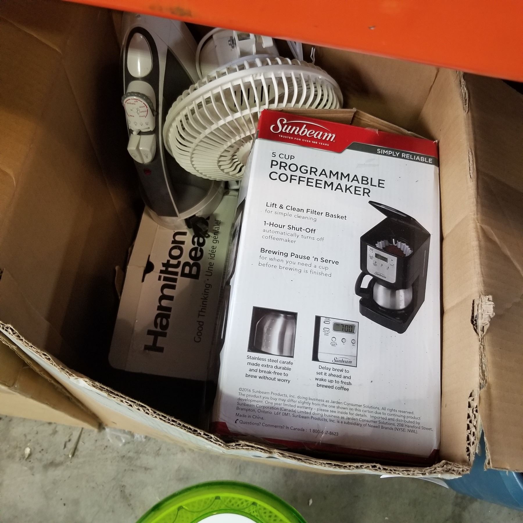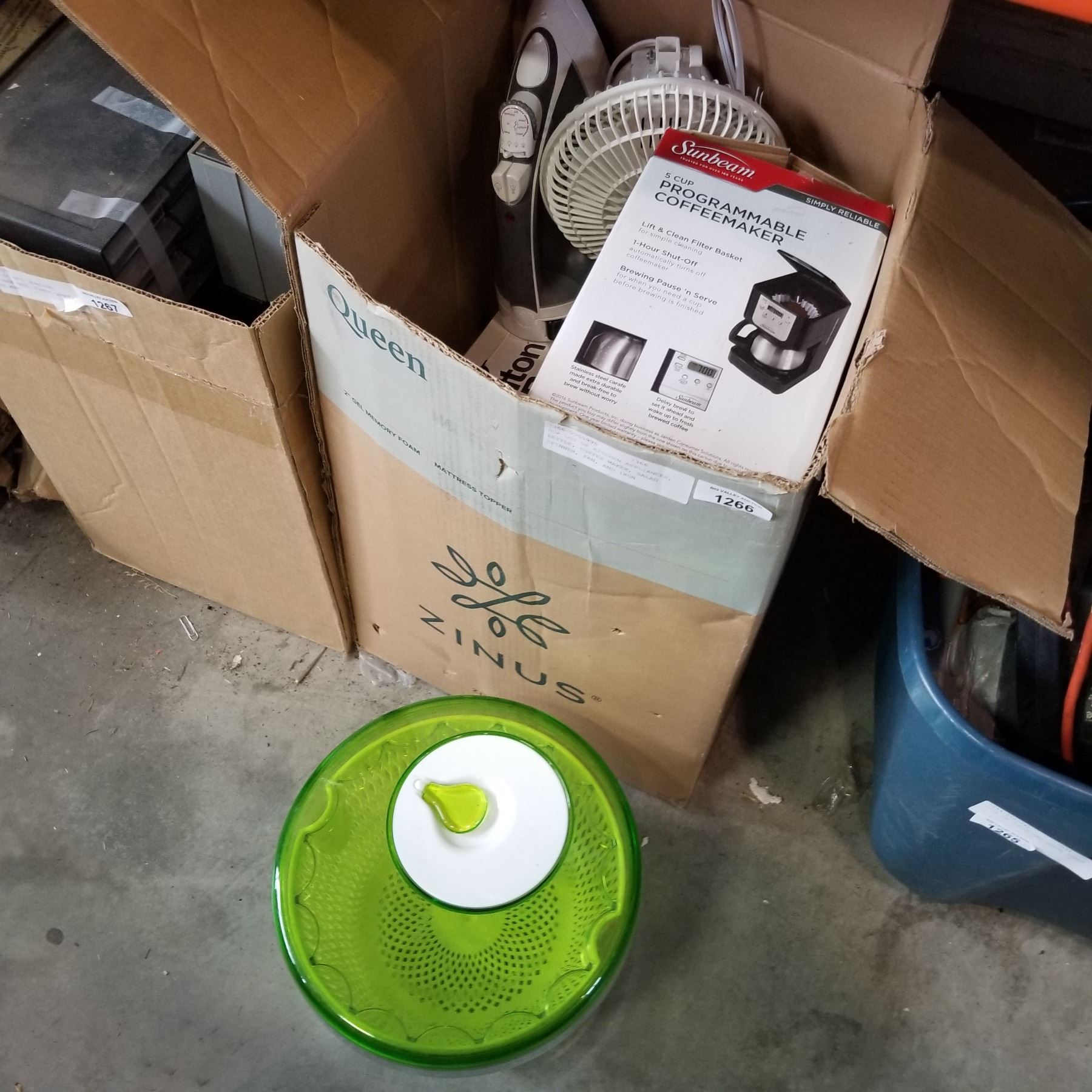 BOX LOT OF KITCHEN APPLIANCES, KETTLE, COFFEE MAKER, SALAD SPINNER, FAN, AND IRON