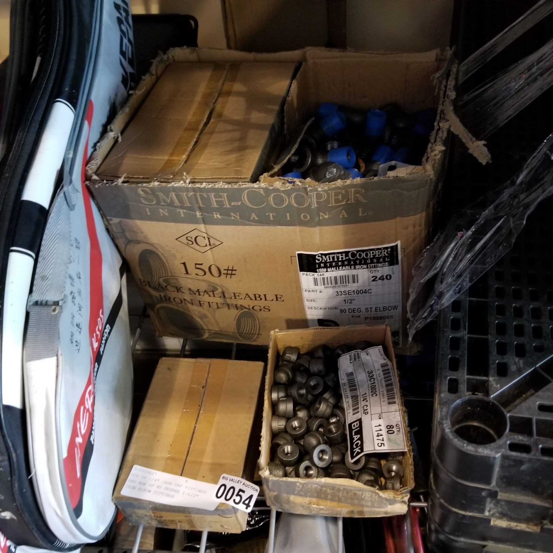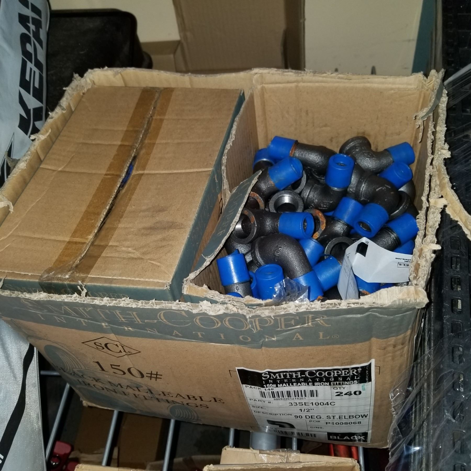 BOX OF 1/4" IRON CAP FITTINGS AND BOX OF 90 DEGREE 1-1/2" IRON ELBOW FITTINGS