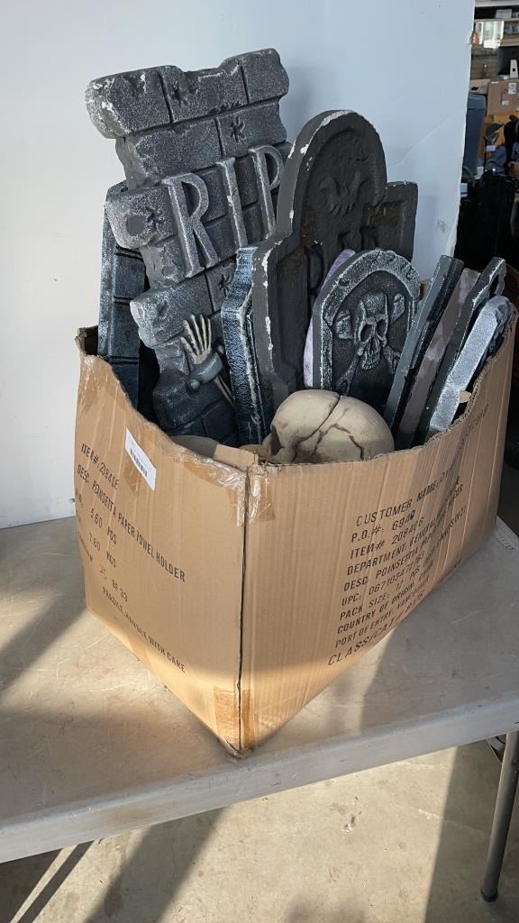 BOX OF 12 FOAM TOMBSTONES AND 6 FOAM SKULLS