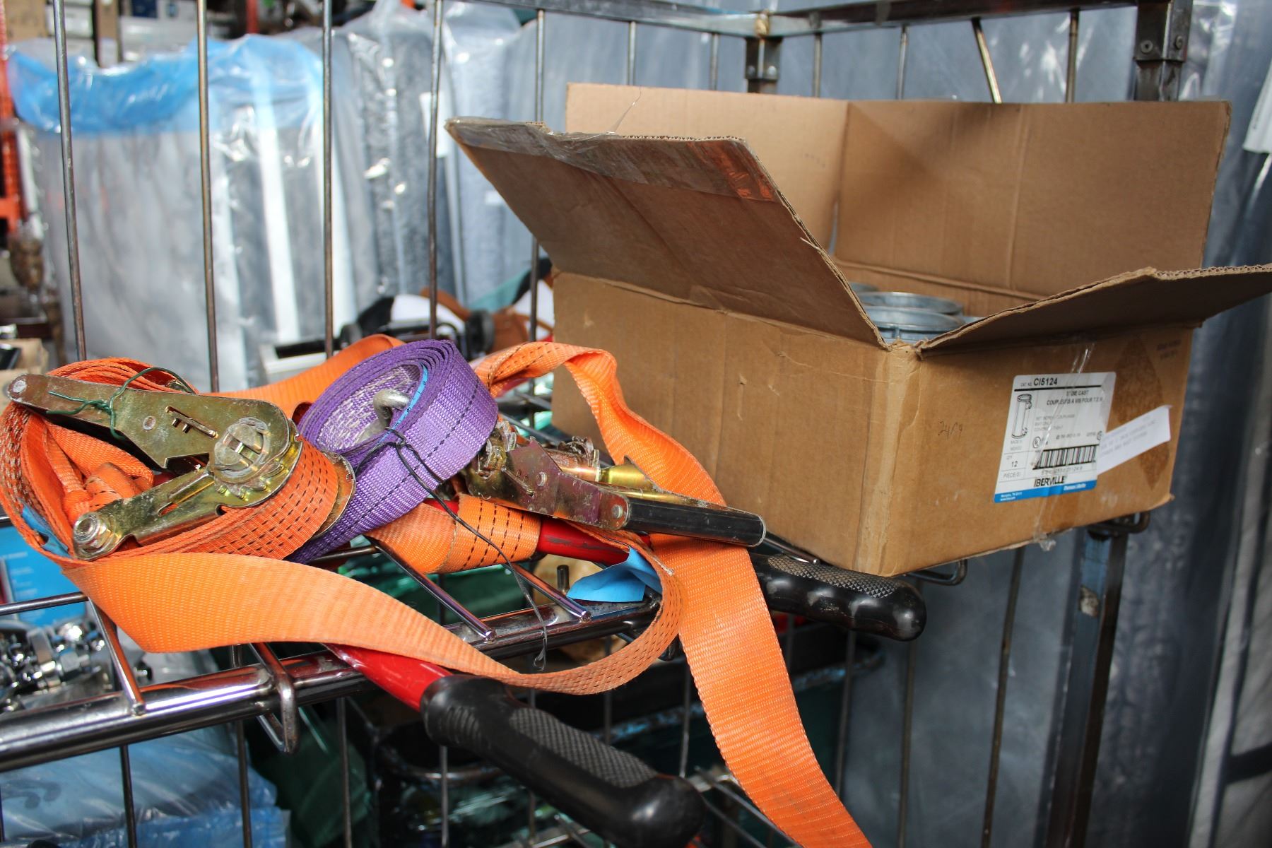 BOX OF 3 INCH COUPLERS LOAD STRAPS AND BOLT CUTTERS
