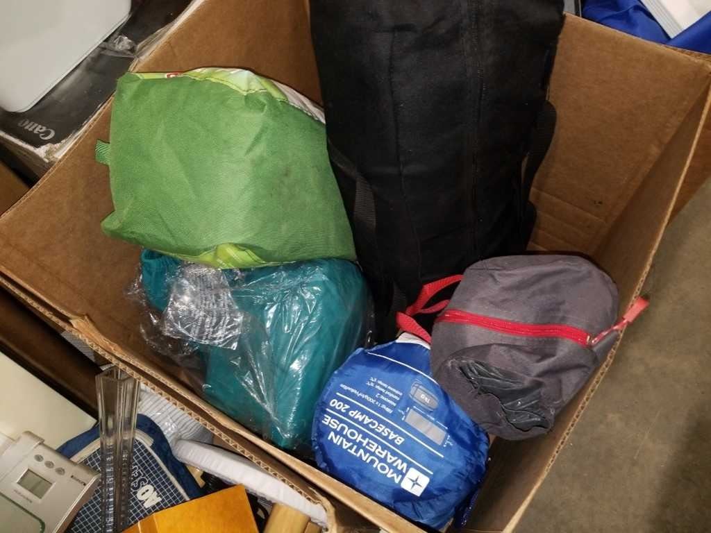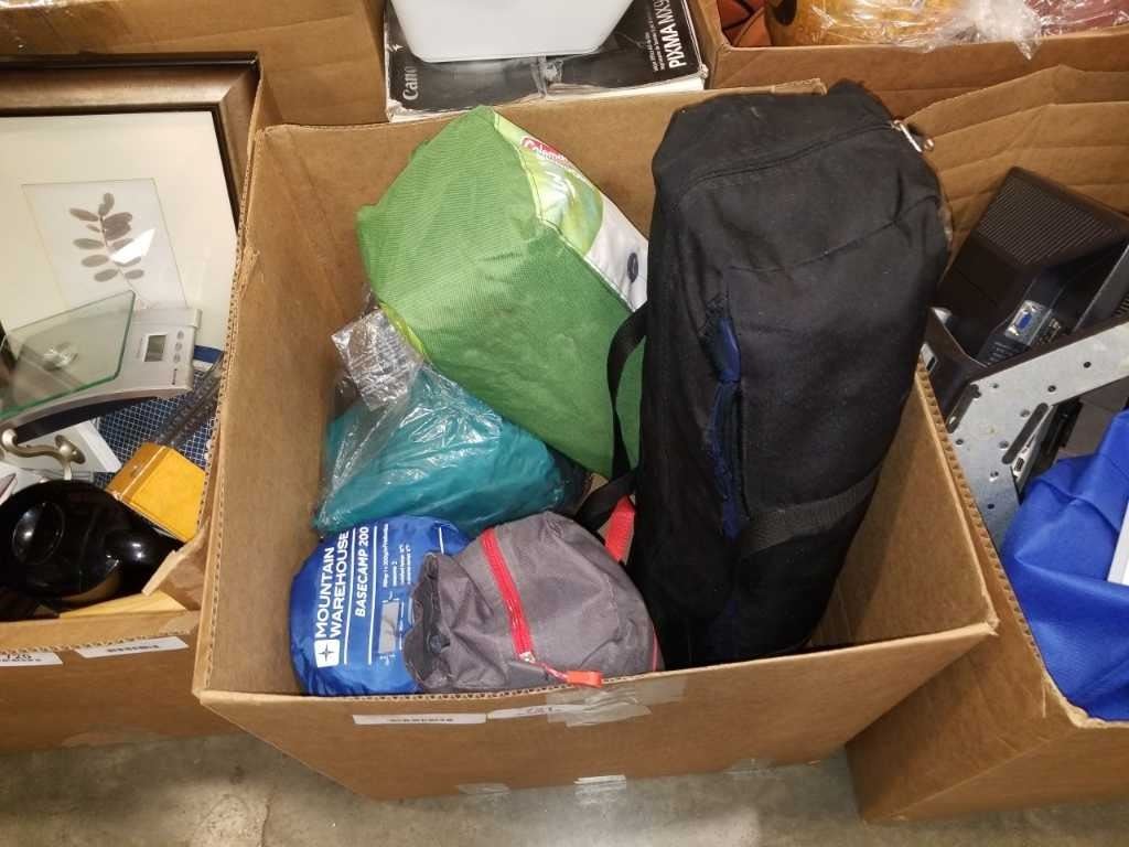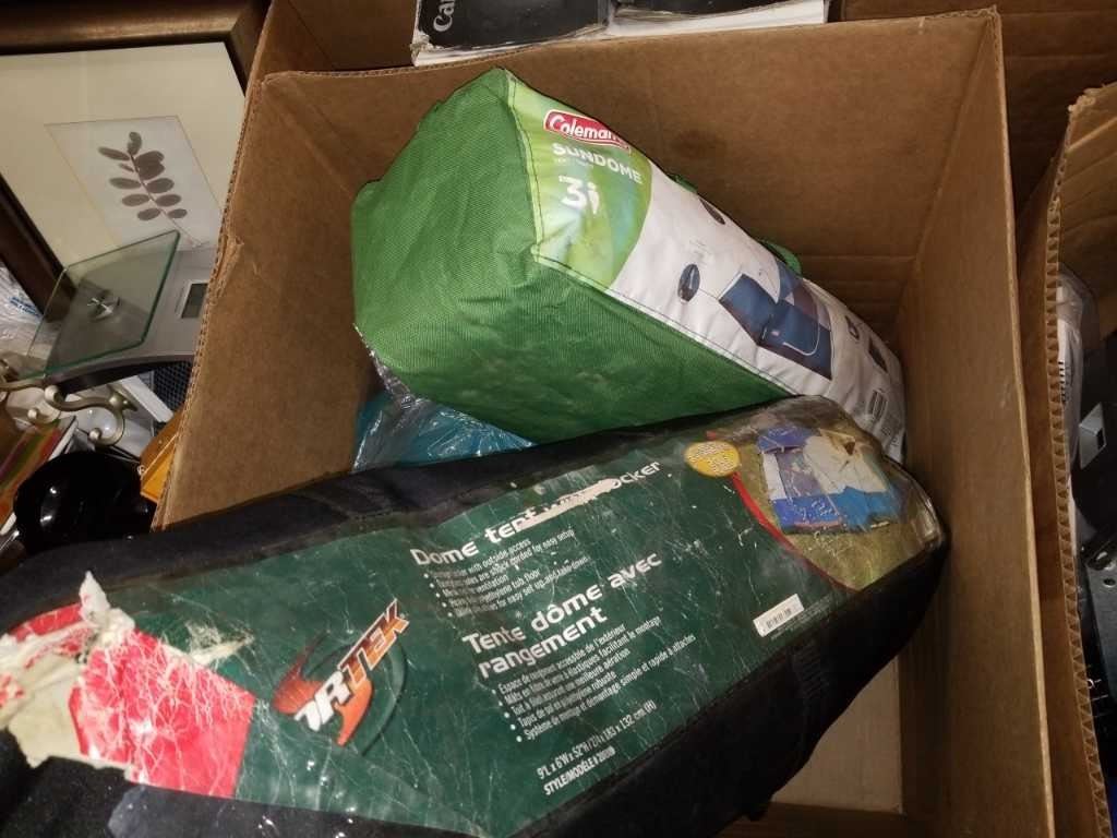 BOX OF 3 TENTS, SLEEPING BAG, AIR MATTRESS, ETC