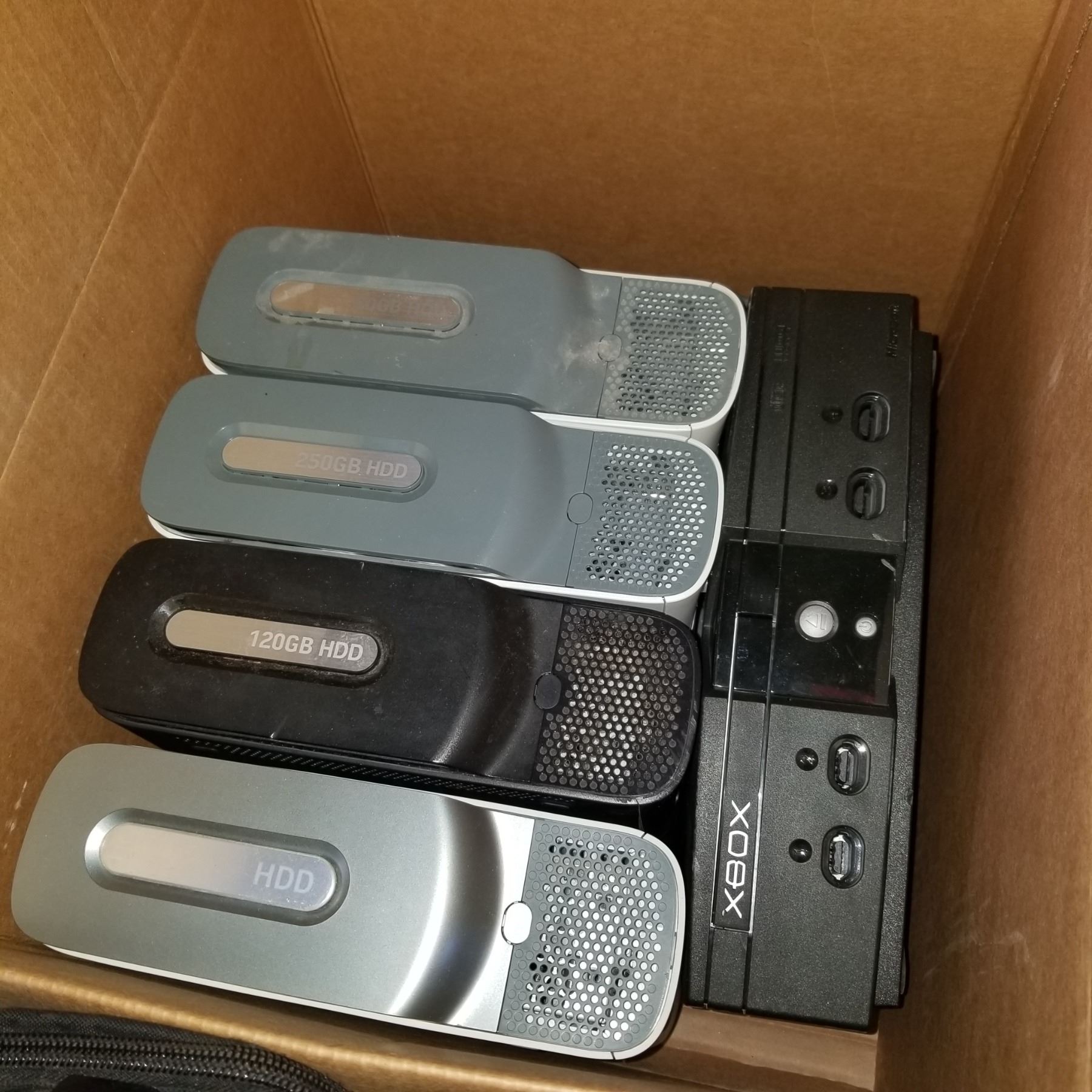 BOX OF 5 X-BOX CONSOLES AND POWER CORDS