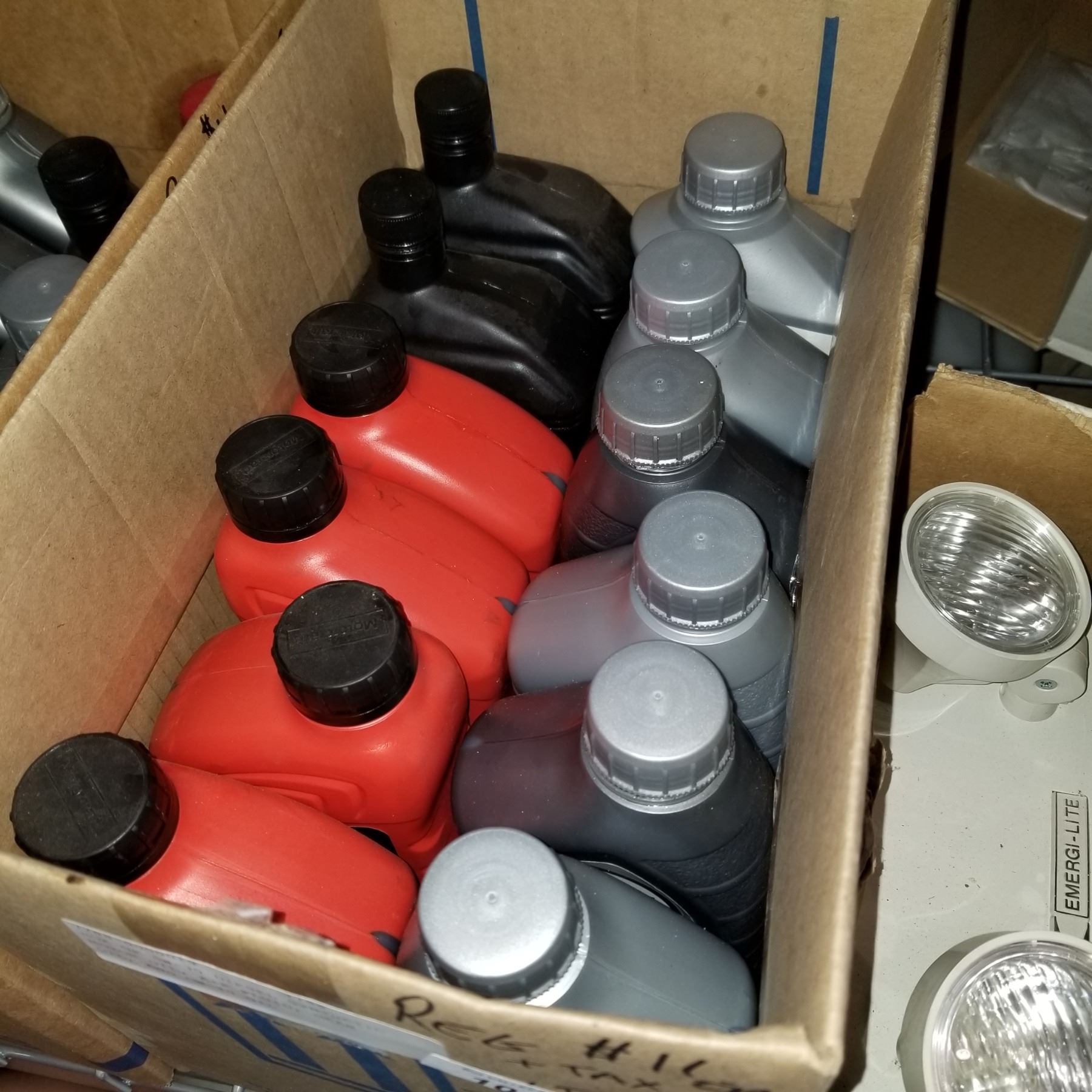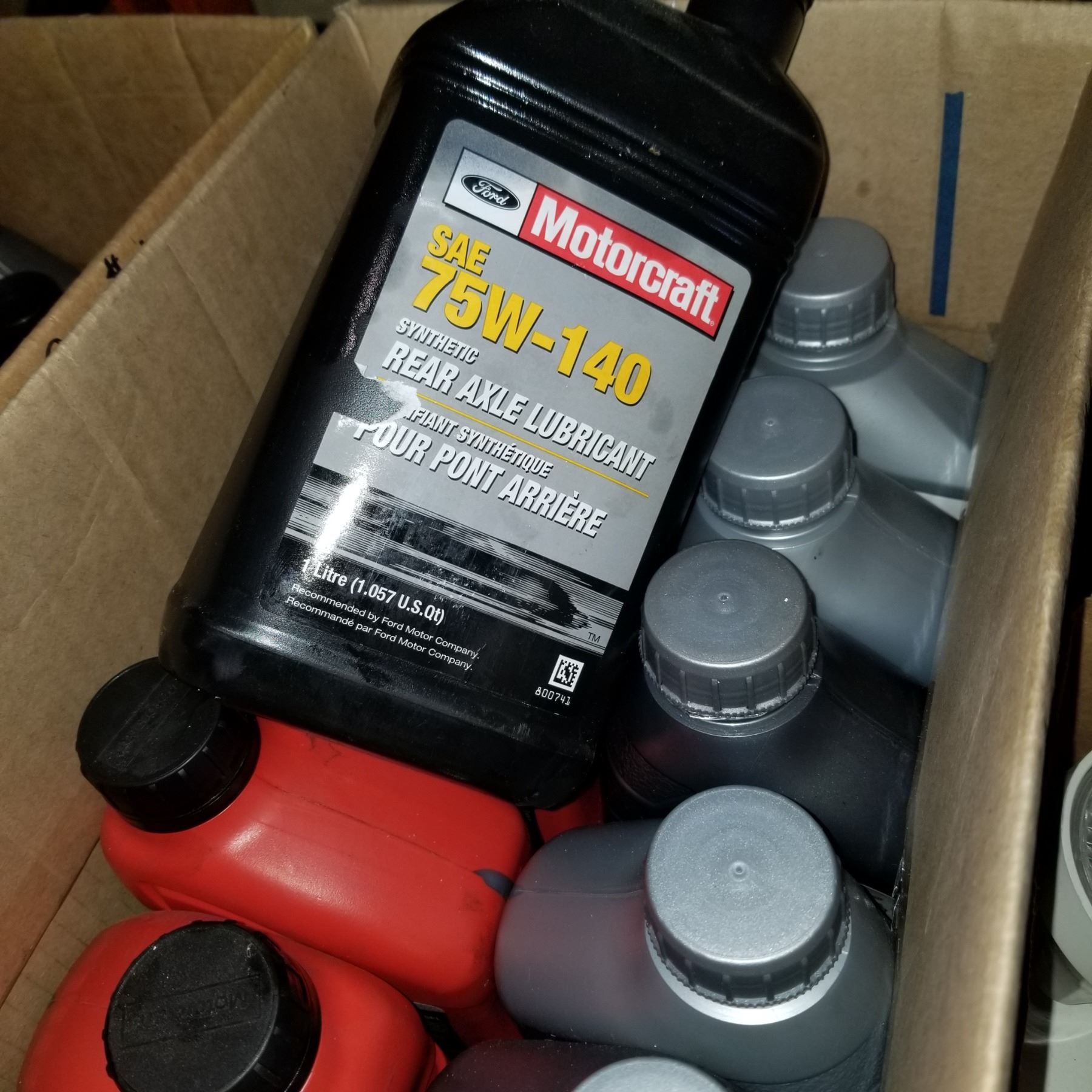 BOX OF 5W-30 DIESEL SYNTHETIC MOTOR OIL, A+F FLUID, GEAR OIL, AND OW-20 OIL