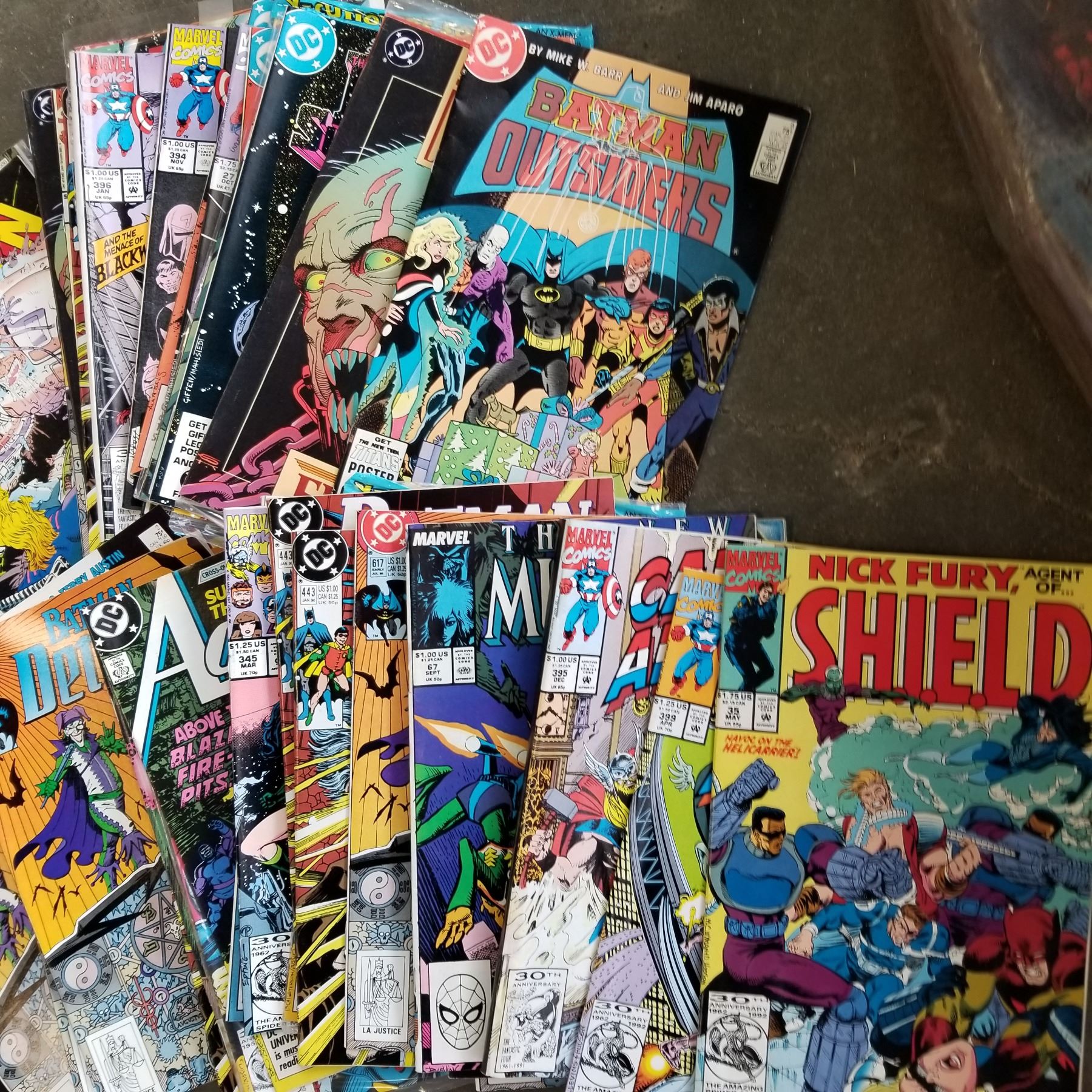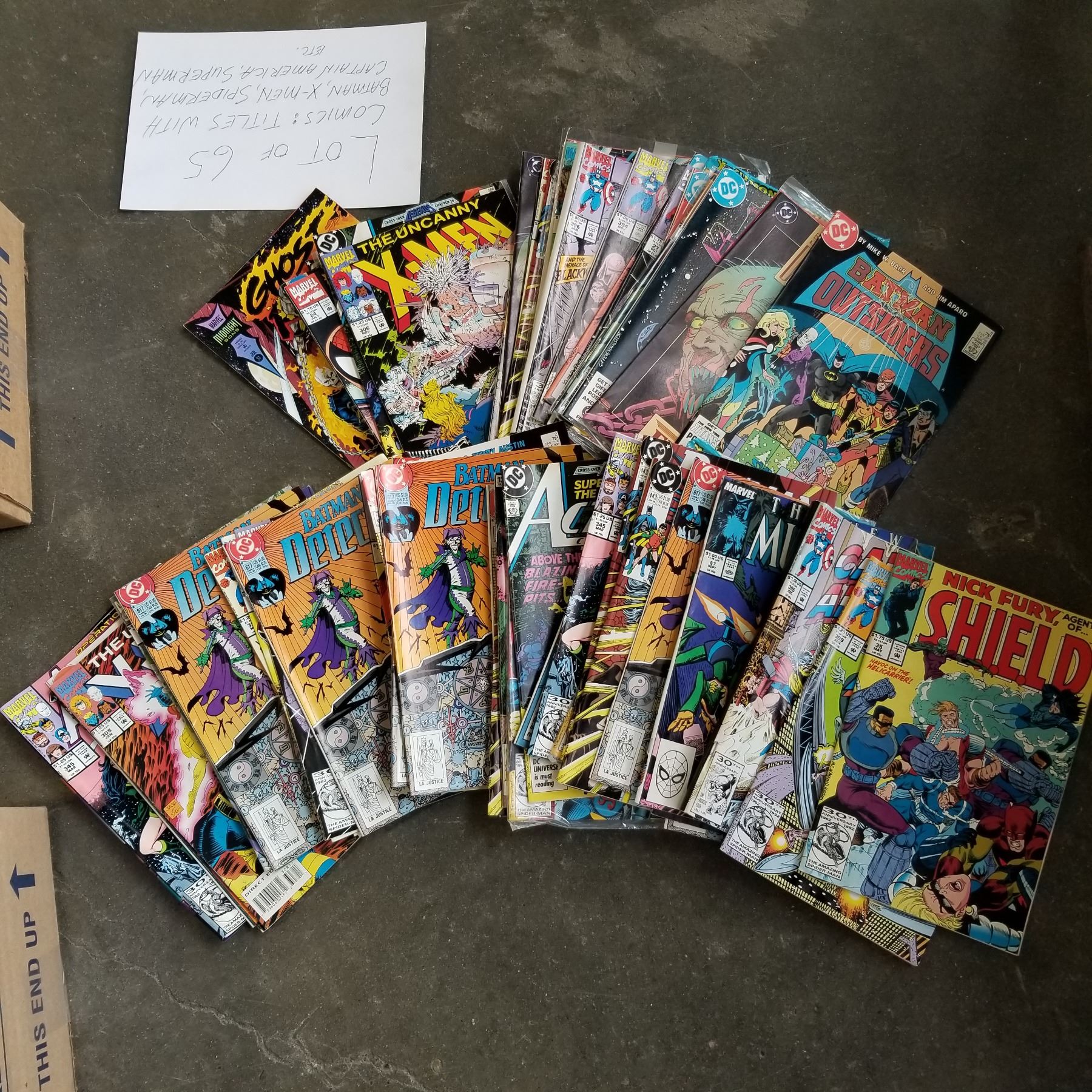 BOX OF 65 COMICS, SPIDERMAN, XMEN, BATMAN, CAPTAIN AMERICA, SUPERMAN, ETC