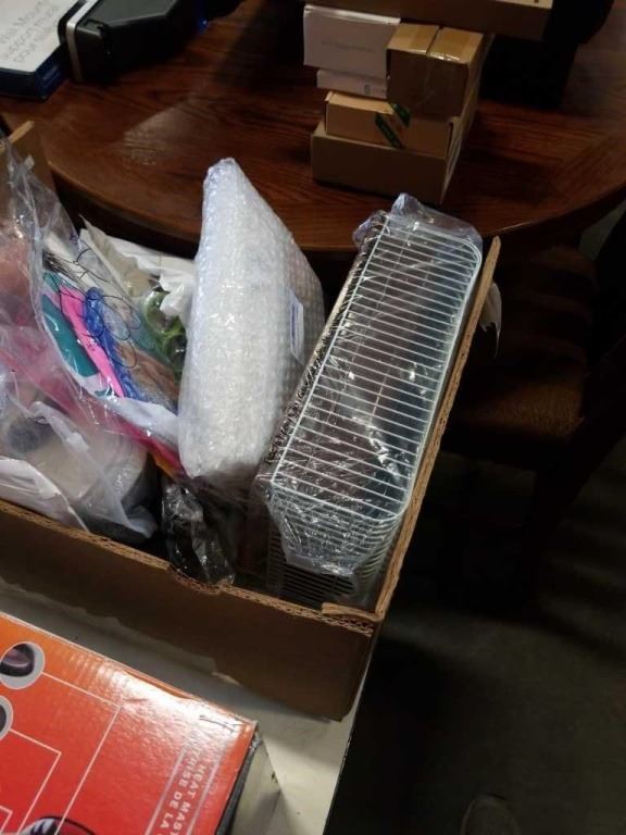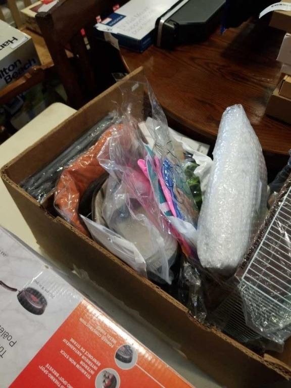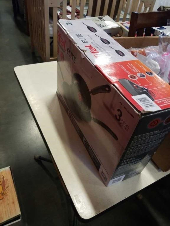 BOX OF AMAZON OVERSTOCK ITEMS AND USED TFAL ELITE 3 PIECE PAN SET