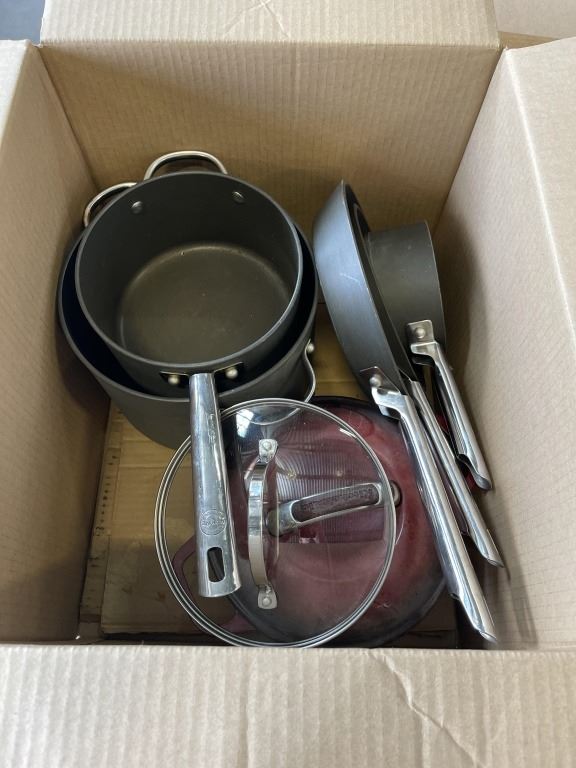 BOX OF ANALON POTS AND PANS WITH KITCHENAID POT AND LID