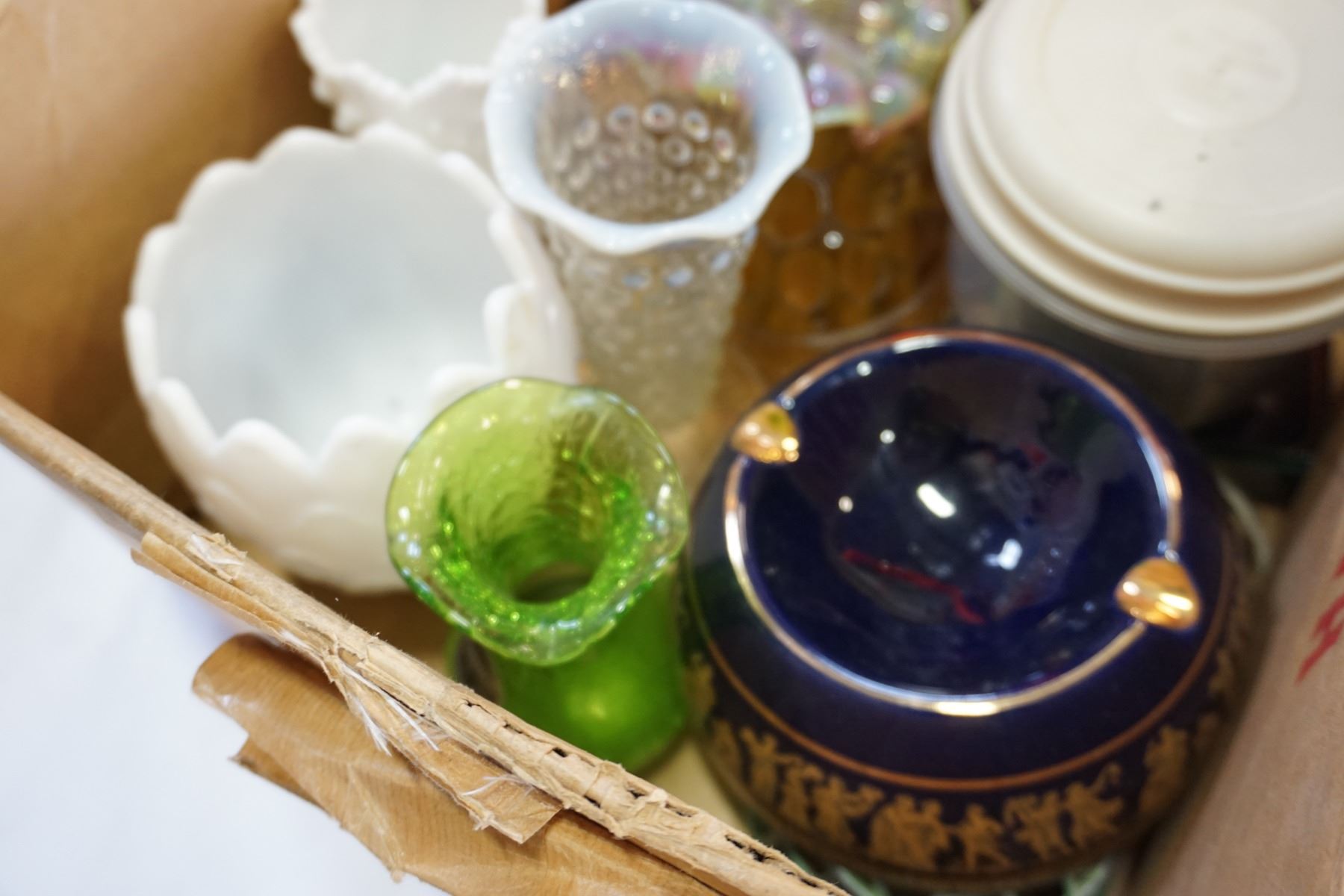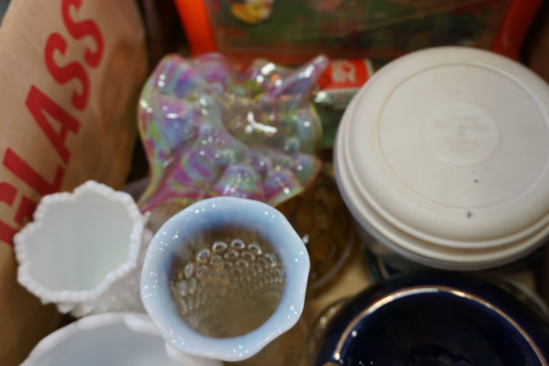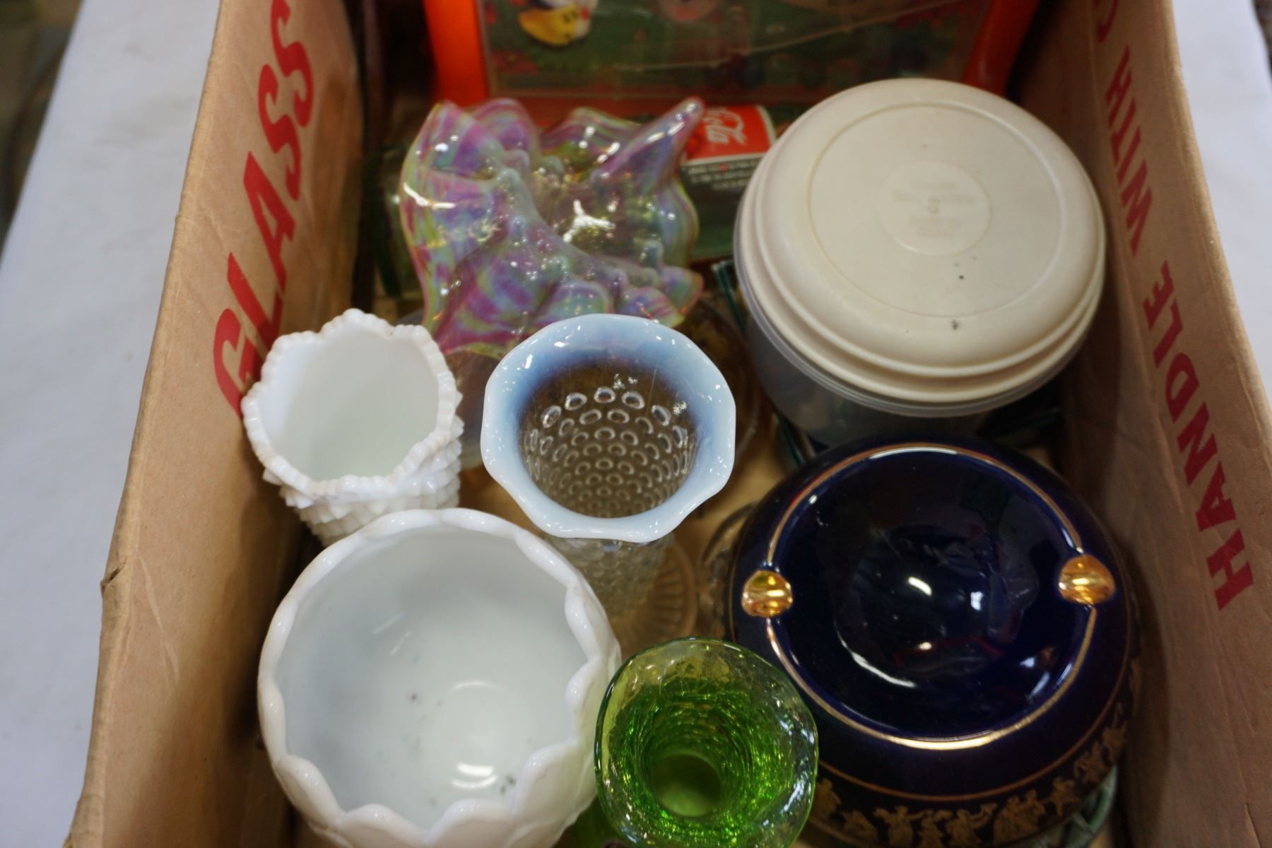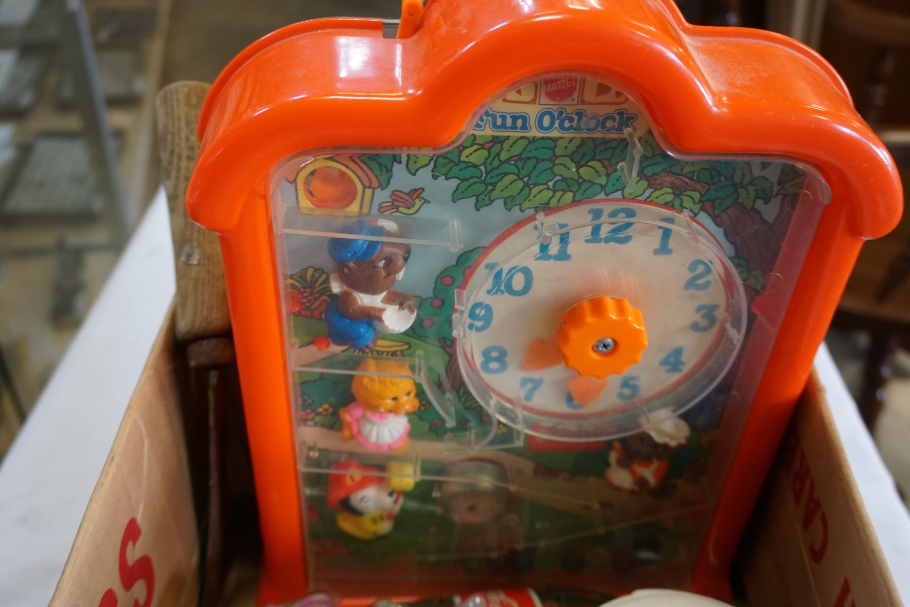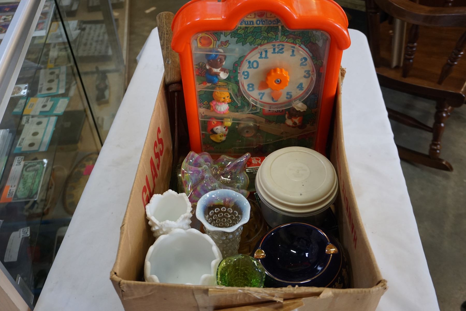 BOX OF ANTIQUE COLLECTIBLES, INCLUDING MATTEL FUN OCLOCK TOY