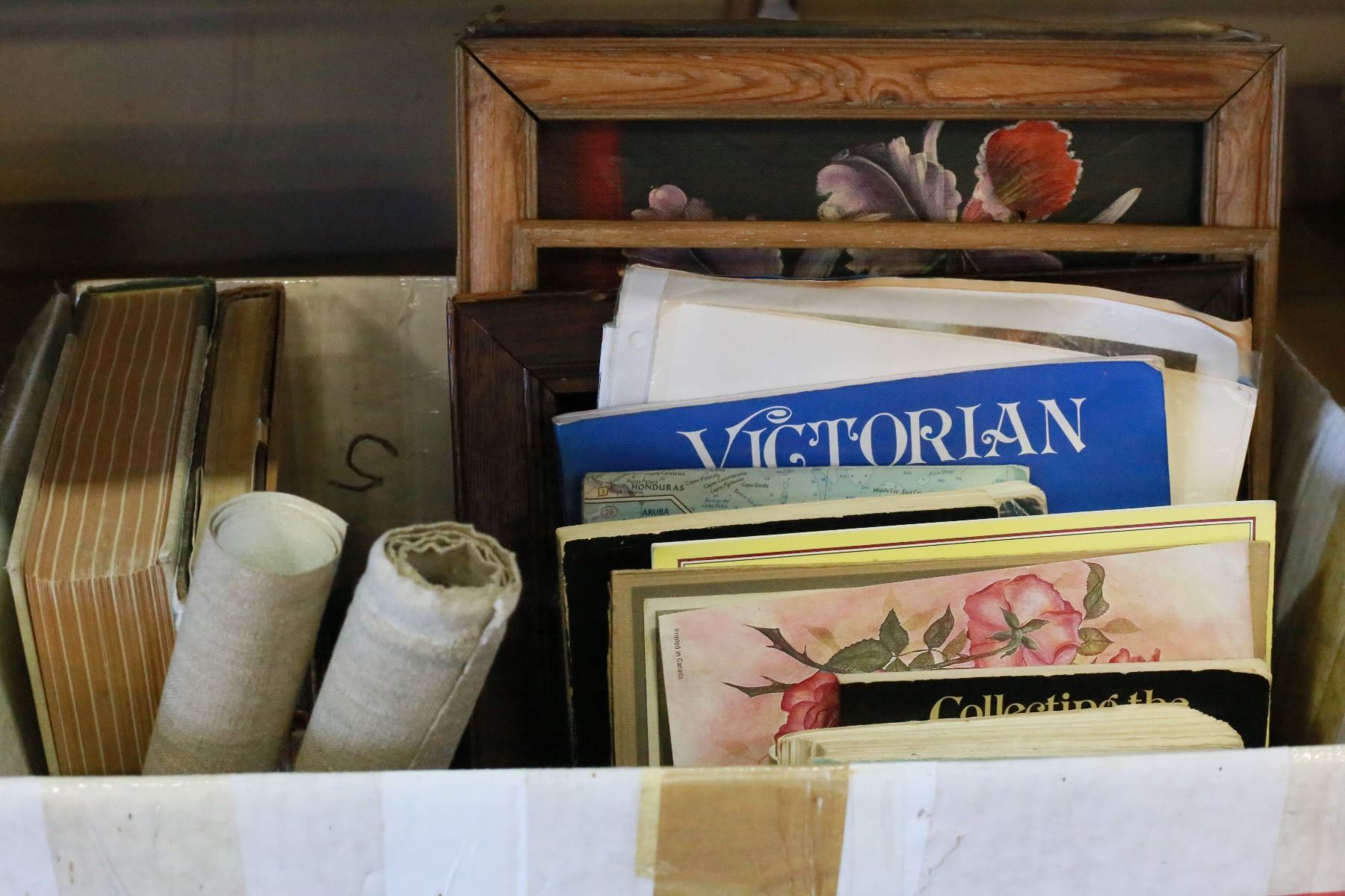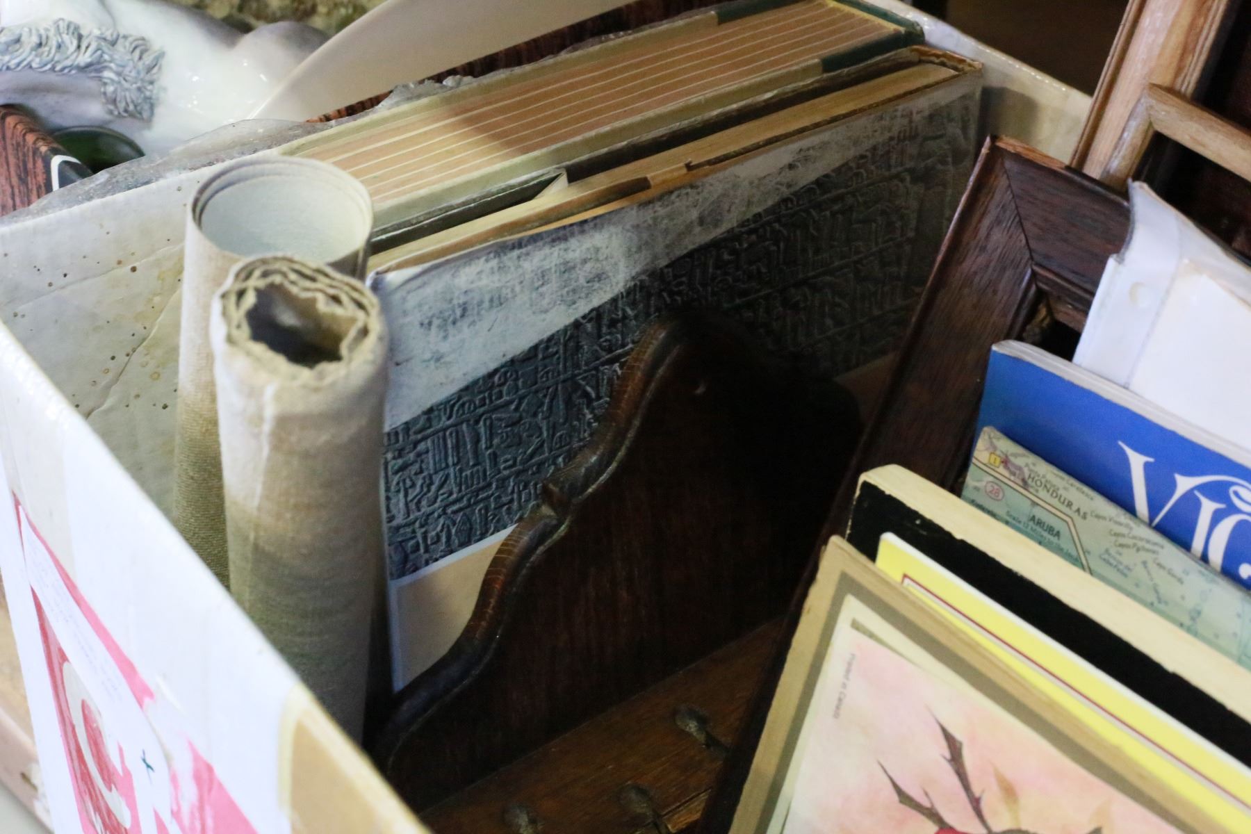 BOX OF ANTIQUE-ING BOOKS BIRD BOOK FRAMES AND PICTURES