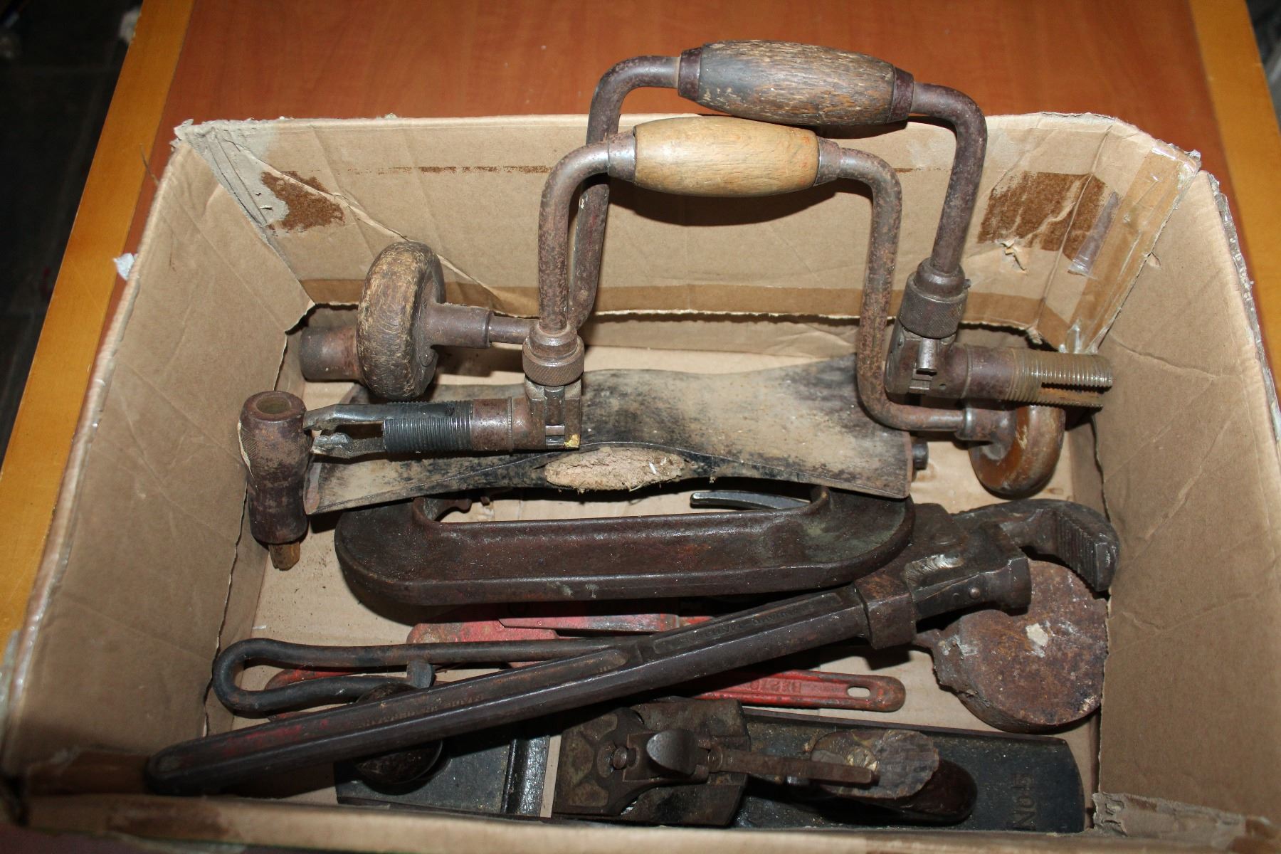 BOX OF ANTIQUE TOOLS AXEHEAD PIPE WRENCHES HAND DRILLS