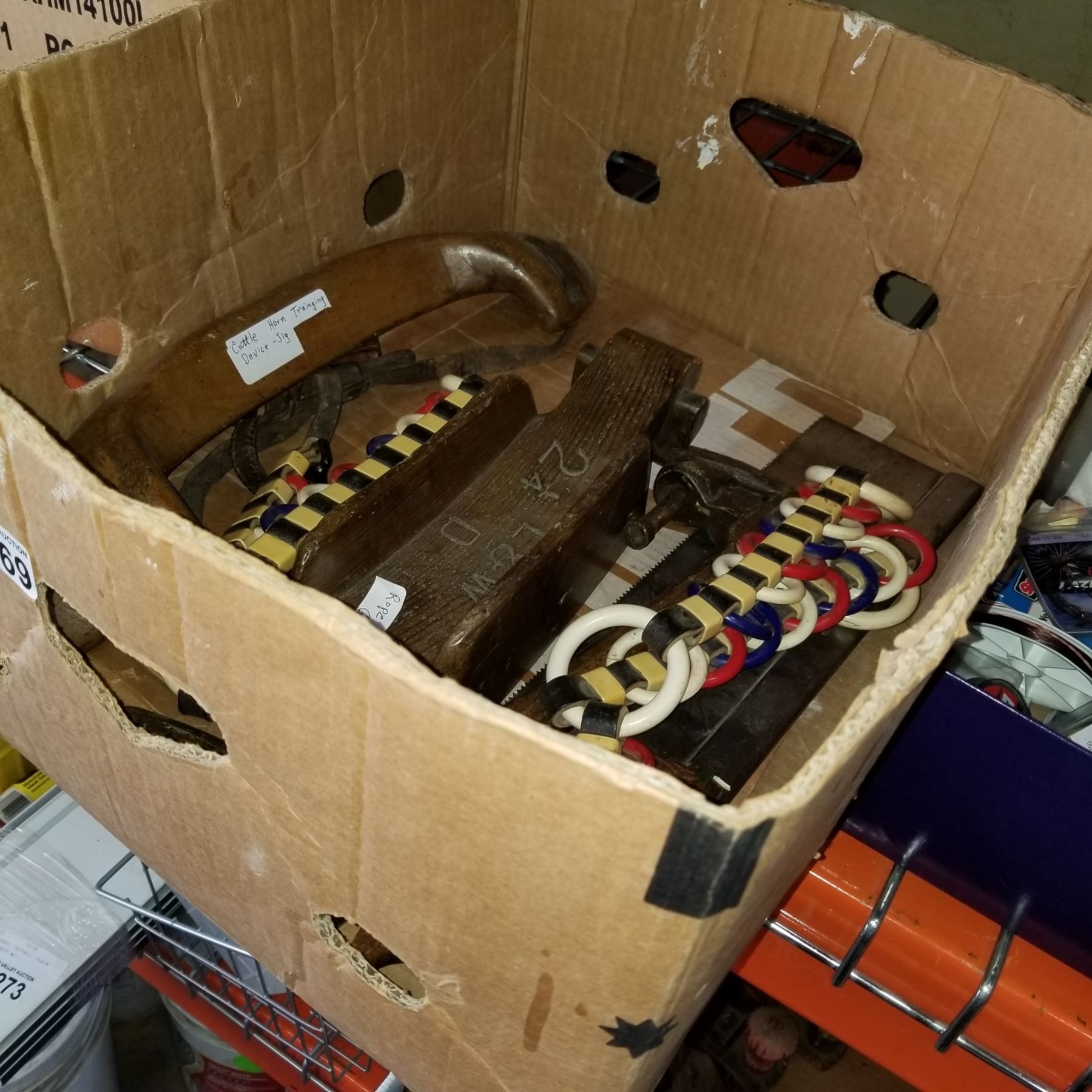BOX OF ANTIQUE TOOLS, CATTLE TRAINING JIG, AND ROPE MAKERS GAUGE