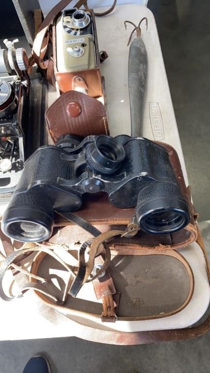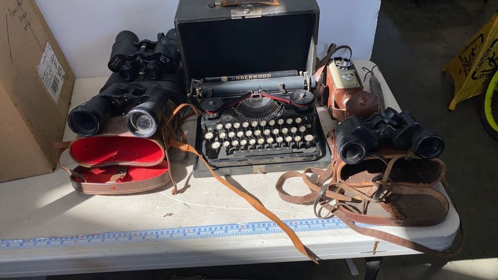BOX OF ANTIQUE TYPEWRITER 3 PAIR BINOCULARS AND CAMERA