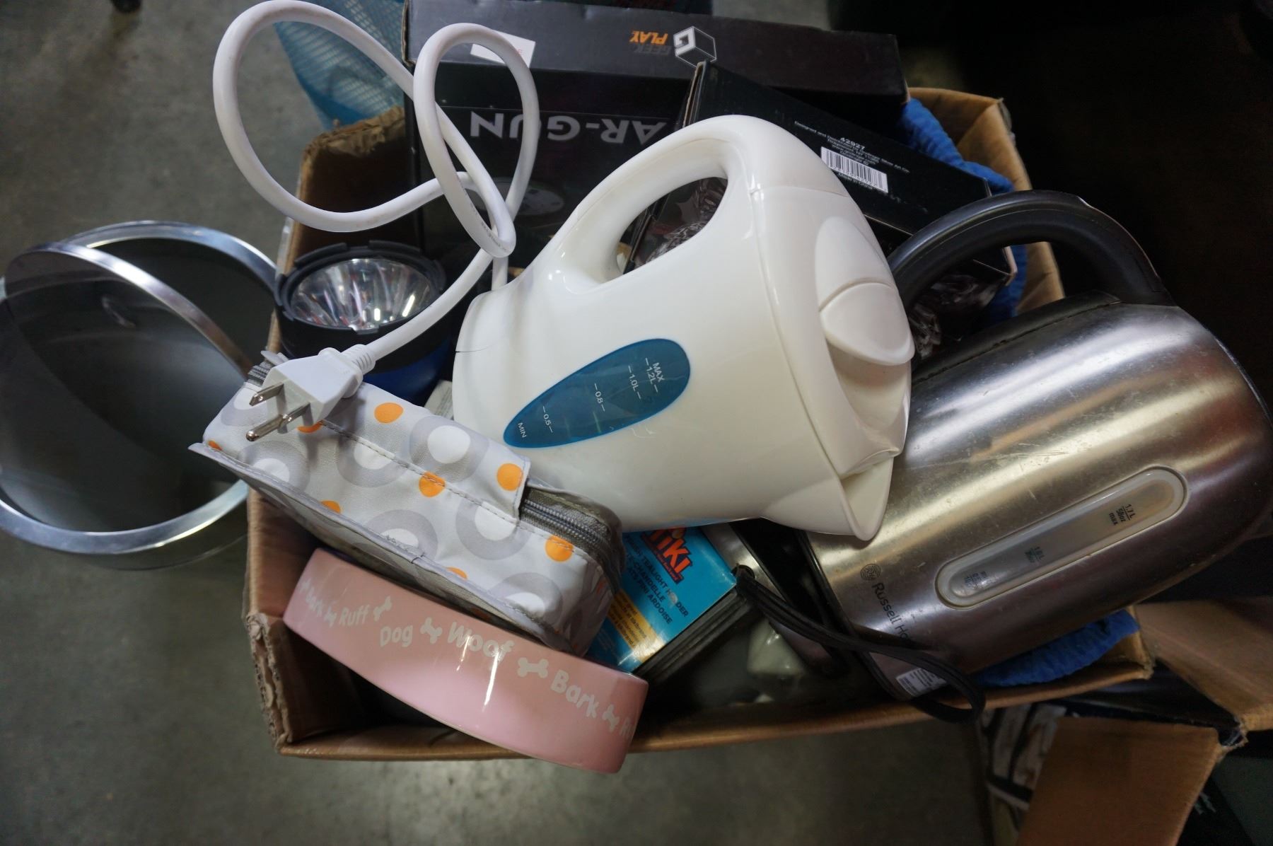 BOX OF APPLIANCES, BLENDER, CARS LIGHT, AND HOSE