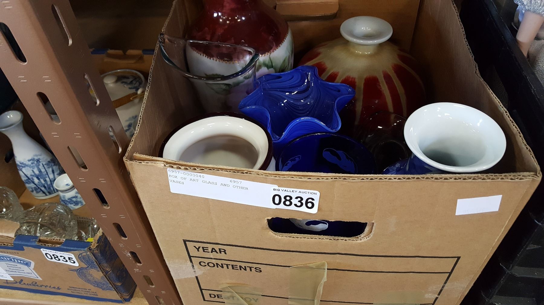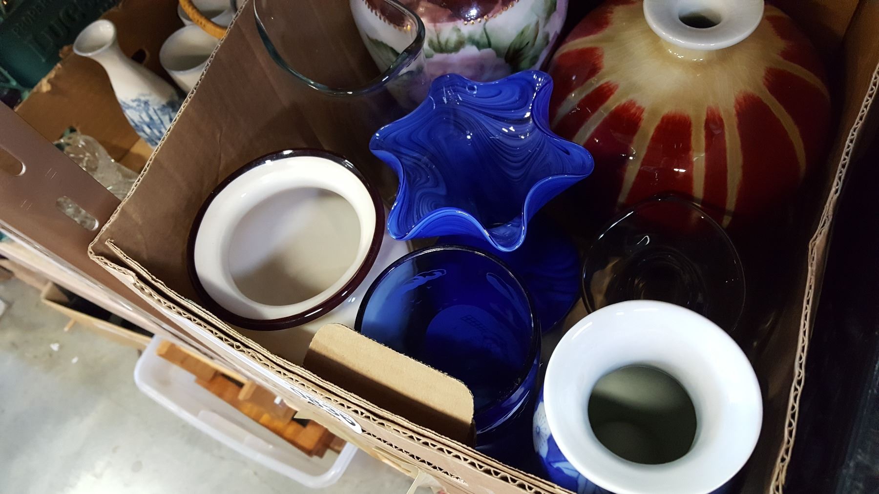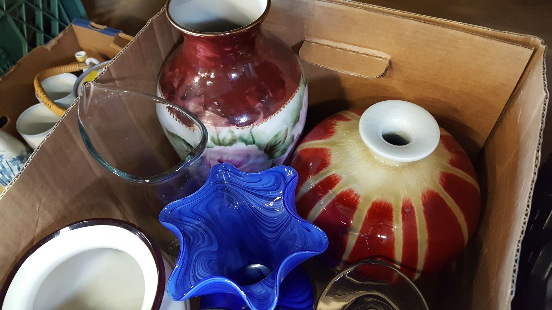 BOX OF ART GLASS AND OTHER VASES