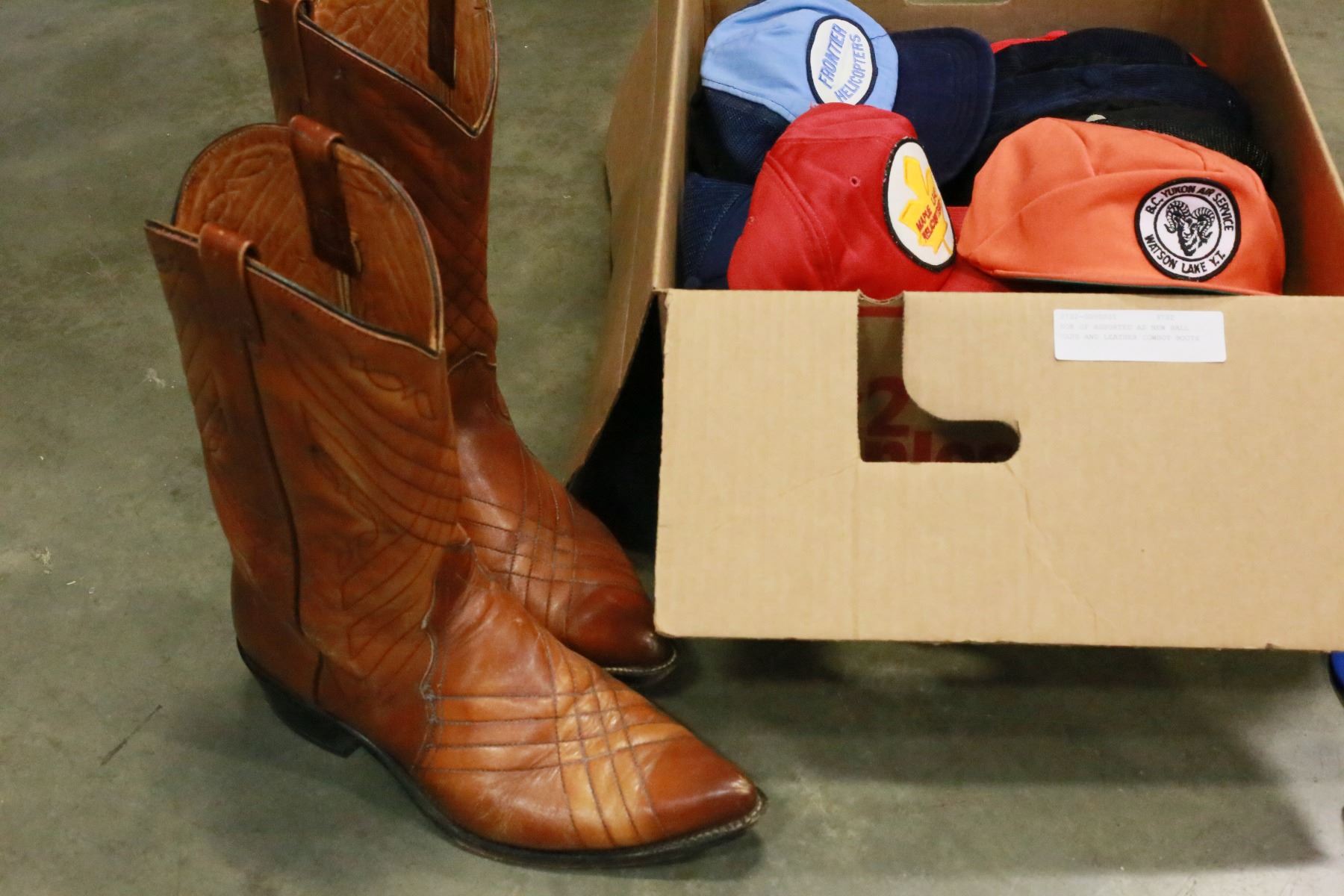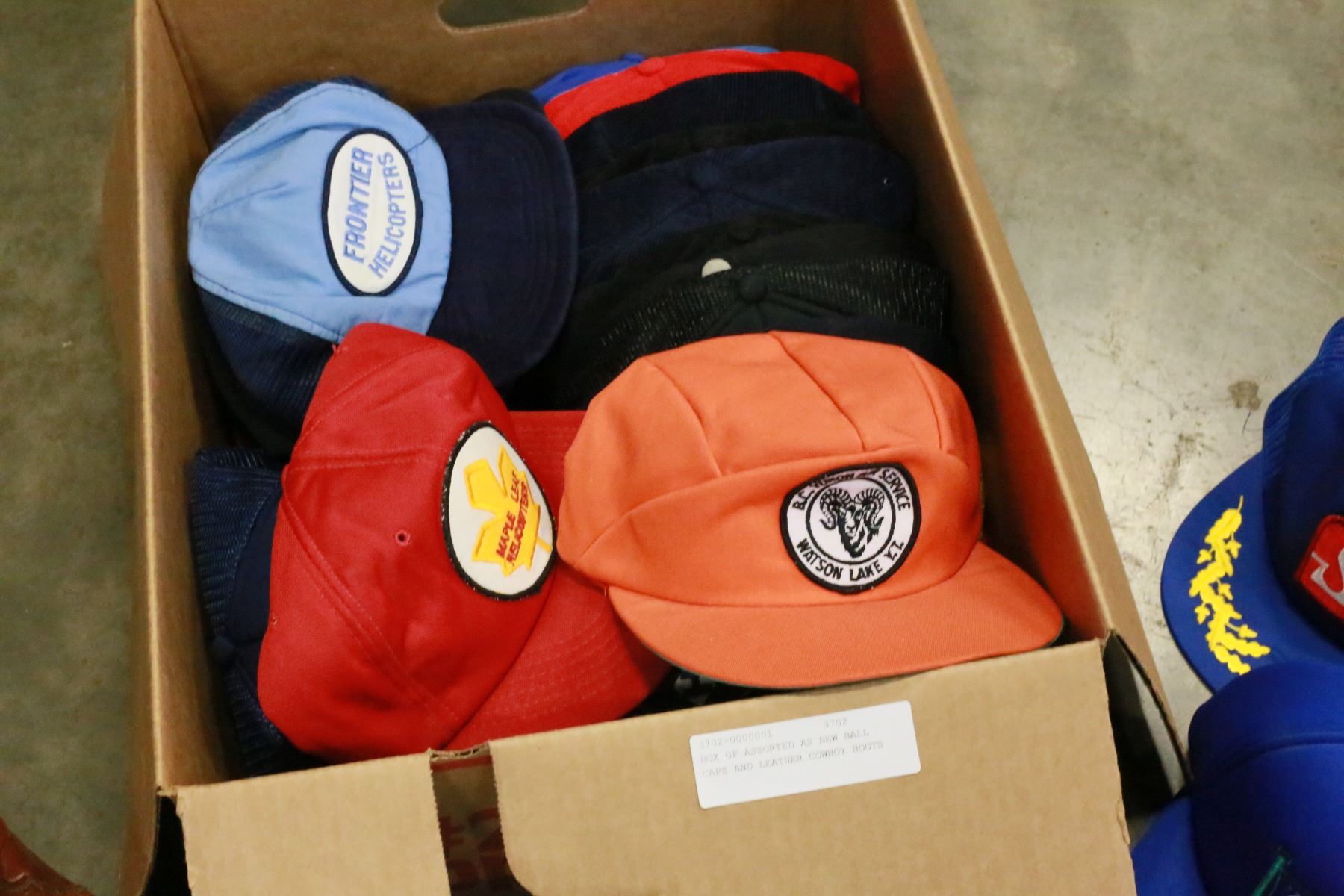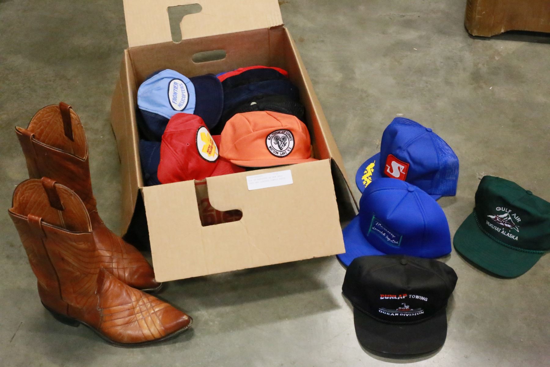 BOX OF ASSORTED AS NEW BALL CAPS AND LEATHER COWBOY BOOTS
