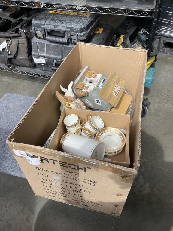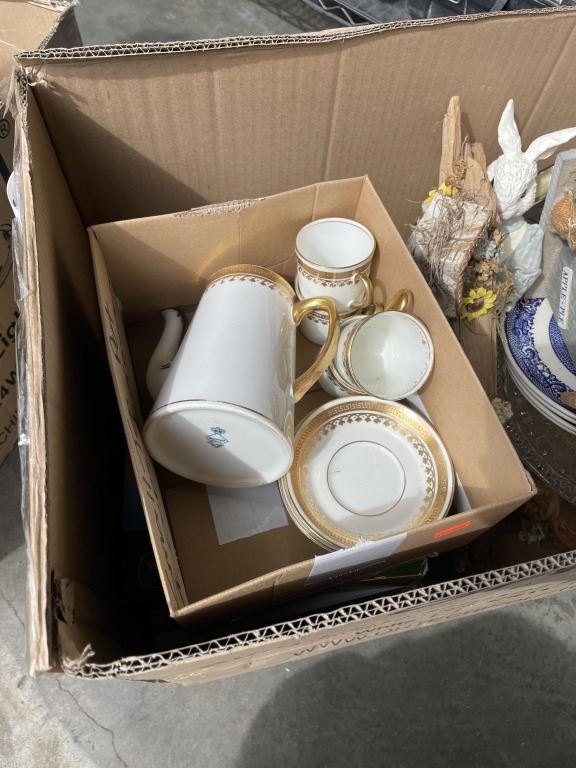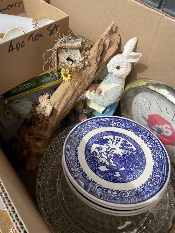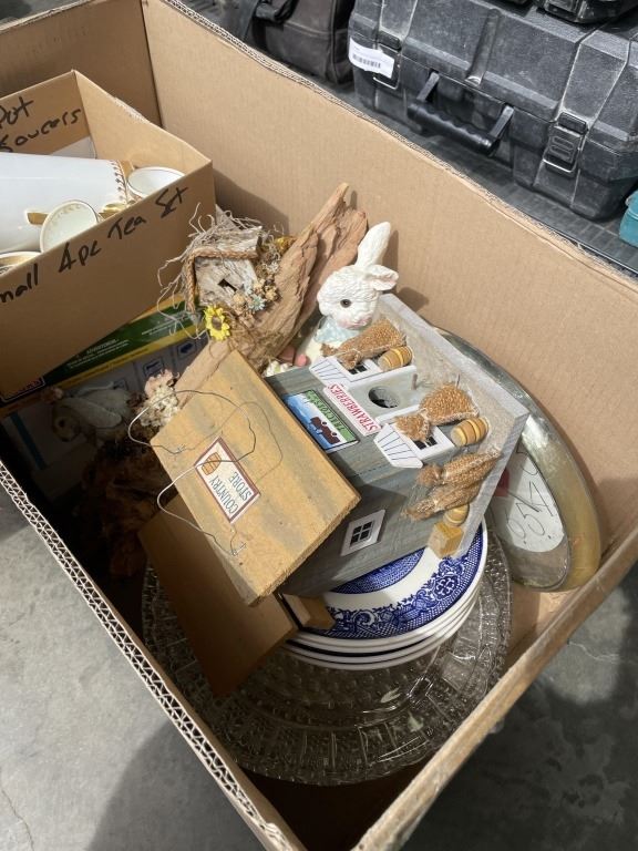 BOX OF ASSORTED COLLECTABLES. WOODEN ITEMS, TEA SET ETC